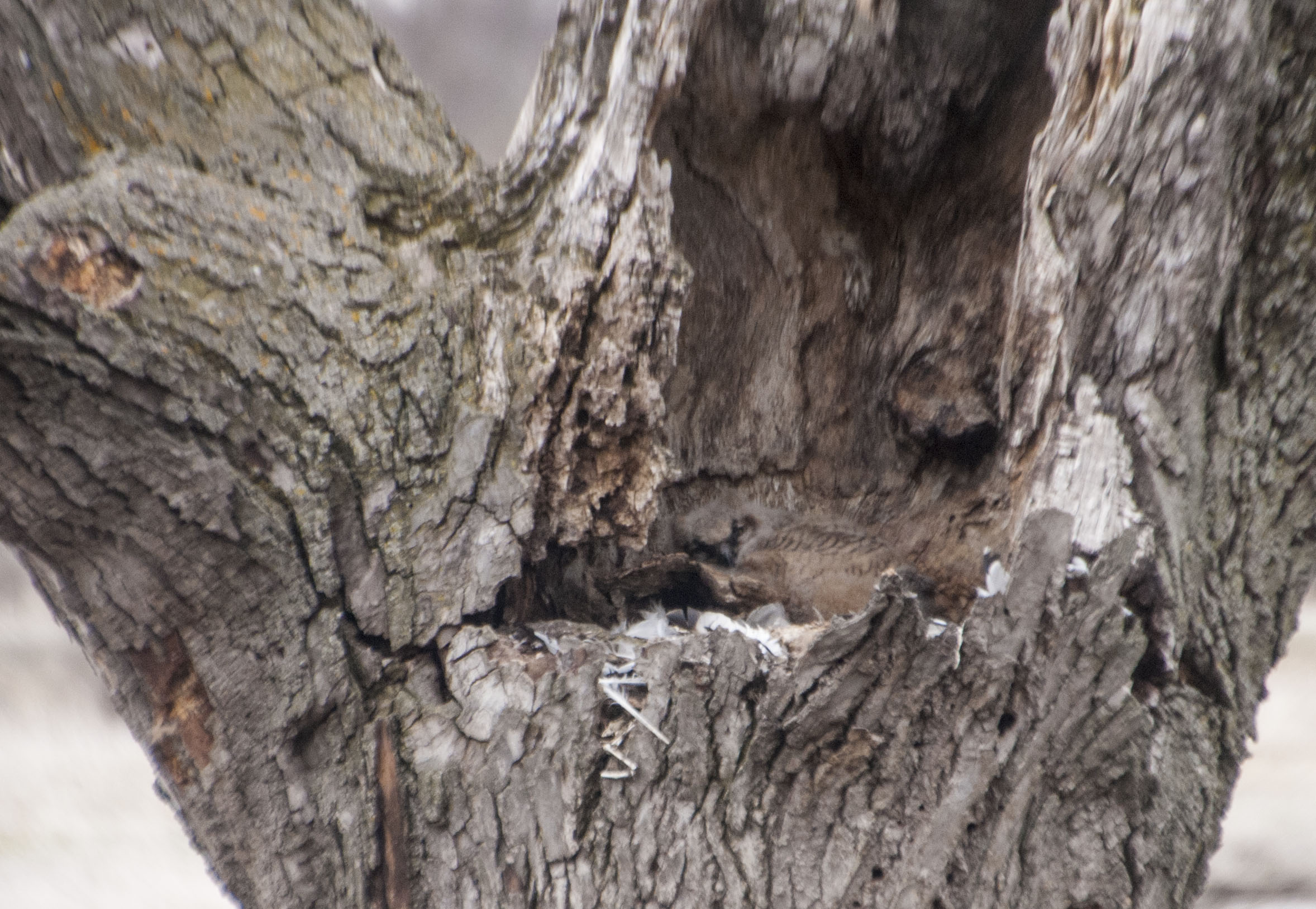 In the river valley we’ve noted heads bobbing in the nests of Bald Eagles, and was fortunate to have been guided to the nest of a Great Horned Owl. If one looks very closely at my photograph, you can see the well camouflaged owlet nestled inside the nest.