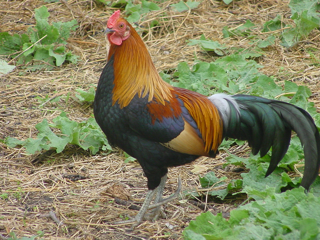 Spurz, our little Jungle Fowl rooster, is also at the top–the bigger ladies may not respect him in other ways, but they don’t chase him from the feeder. The second-tier hens are also fully mature from last year’s starter flock–they’re just smaller than the others (though as big as, or bigger than Spurz), so they have to wait their turn.