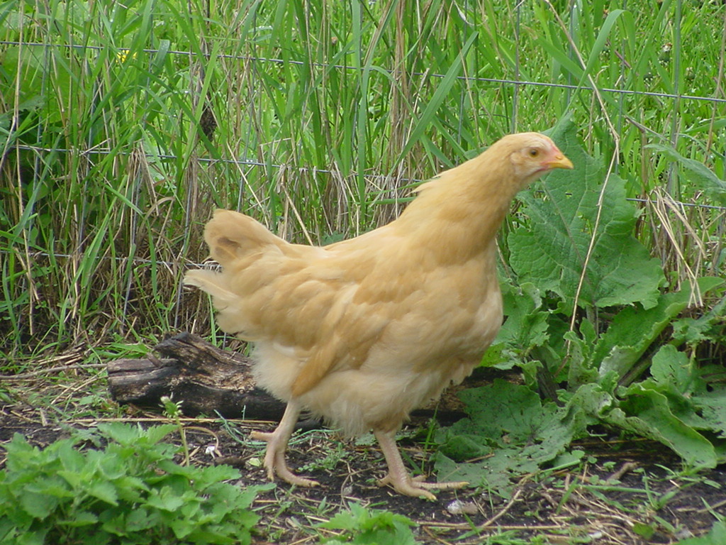 Last on the pecking order are the youngest–the nine Buff Orps and Black Australorps that are catching up to the “delinquents” in size, but who know better than to venture into the henhouse when the big girls are eating. Well, all except for this one rogue Orpington, who starts to peek in the door once the big girls have gone out and the second-tiers are getting at the “goods.” I think she’s the same one who gives us such grief every evening when it’s time to go in–breaking off from the flock and dodging out of the run to hide back under the currant bushes. I don’t know if it’s cleverness or sheer obstinance, but I do know she’s careful to remain out of range of the Silkies’ cruel beaks.