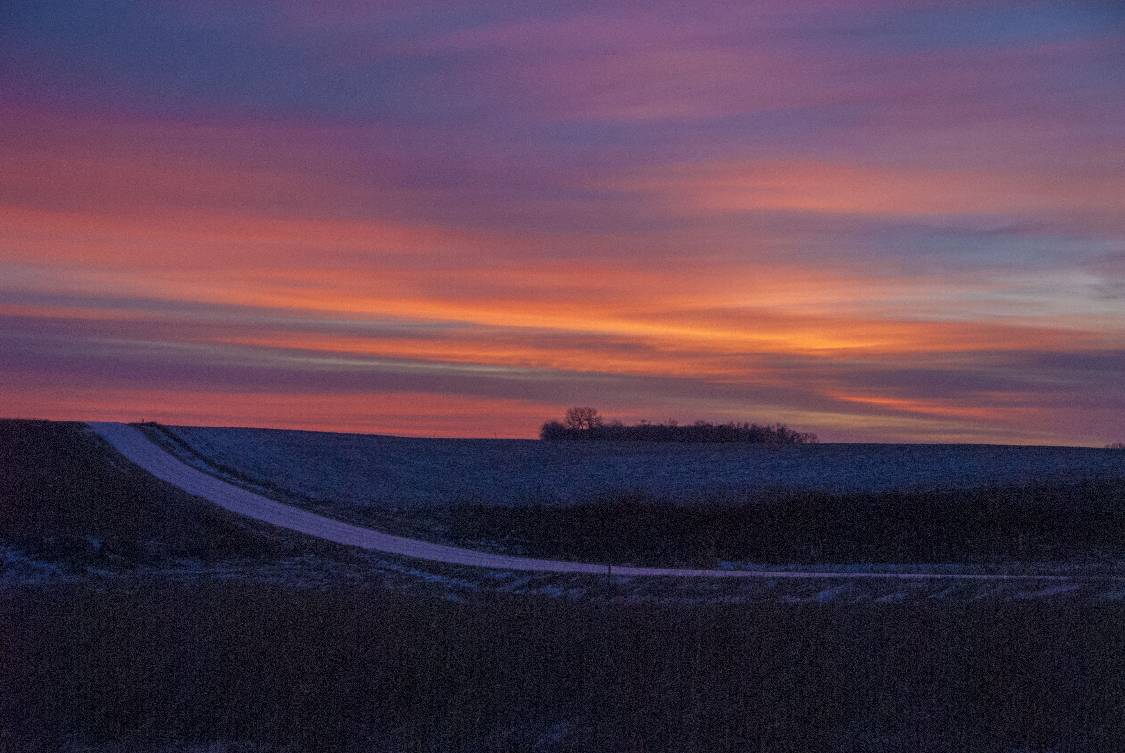 So getting an image in our home prairie of the rising moon was cause for a quiet and pleasing celebration … until this morning. Before I took the dogs for the walk I once again headed to Steen’s WMA to take in that luminous light of pre-dawn, and the prairie wind was creating a new drift across the one-lane country road at the exact spot. Experience is a great teacher. That drift was approached slowly and delicately, and the Versa remains in one piece.