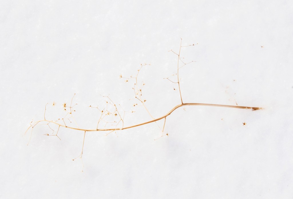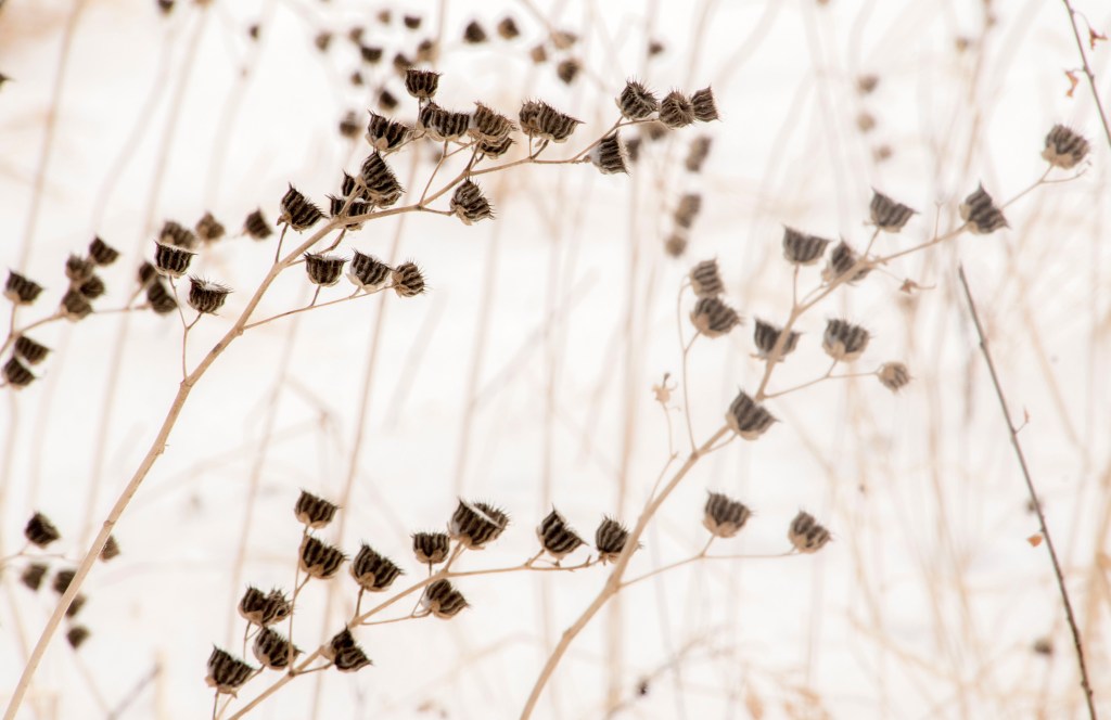 I was dressed warmly enough, although my skiing (if you could call it that!) kept me plenty warm. I saw the woodland a bit differently than before, and the prairie was rather challenging thanks to the uneven drifts and dunes. The two were quite different. Inside the woods the wind wasn’t an issue. It was quiet save for the birds that flitted around either high in the canopy or on the dense underbrush of buckthorn. Nuthatches, chickadees and downy woodpeckers, mainly. A few stubborn leaves caught and hosted bits of fallen snow. In one spot there were a few spindly arms of a plant that seemed to hold dearly to seed clusters that reminded me of those Reese chocolate cups. Was it too close to lunch?