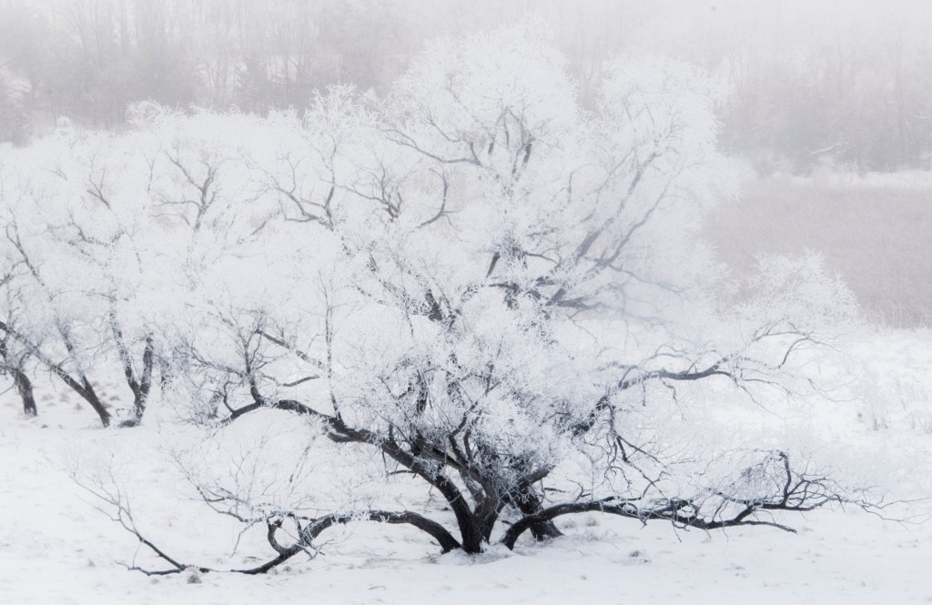 As the curtain is slowly drawn the lighting begins giving mystical joy to this metaphorical stage, for in our temperate part of the country, with below freezing temperatures accompanying this dense and impenetrable grayness, we find a magical hoarfrost coating every inch of fog-touched surfaces, coatings of star-shaped beautiful icy clusters. On trees and prairie grasses, coating every twig and blade as if dusted by a fog fairy. Edgy at a glance, though comforting in a glossy beauty.