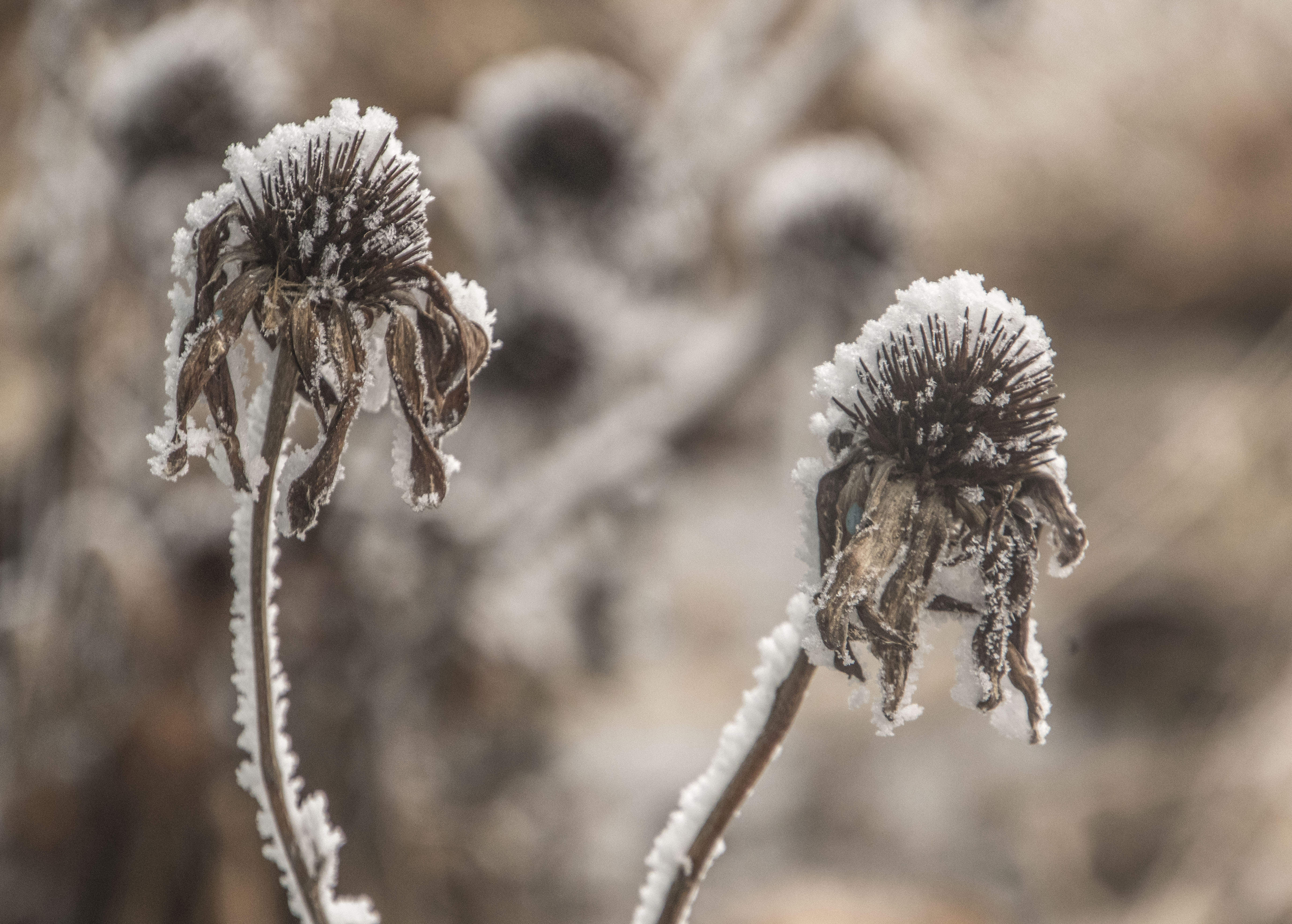 All of which begs for a journey within the ancient and unsolved, where those stark heavy branches of oaks and cottonwoods are suddenly jeweled, where the nuded bulbs of solitary cone flowers glisten as if donning a queen’s crown, where leaves of big bluestem curl poetically within the depths of a prairie, dotted perfectly with frost as surely as they’re coated with poetic drops of dew in a summer sunrise. All magical and mysterious moments.