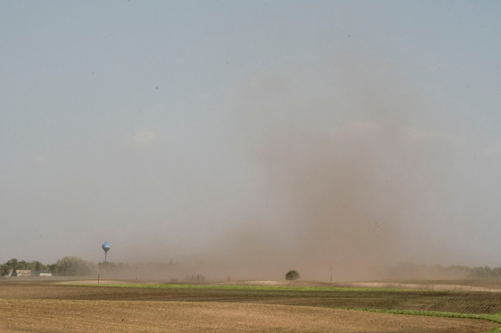 On a field just west of Clinton dirt was blown airborne in dense, swirling clouds. In the greater gusts towers of particles rose high into the sky. Through the dense darkness of the dirt cloud tan spots in the field poked through. A woman who lives in Clinton said, “It’s the ‘Dirty Thirties’ all over again.” She claimed to taste the fine particles. It’s easy to blame the wind.