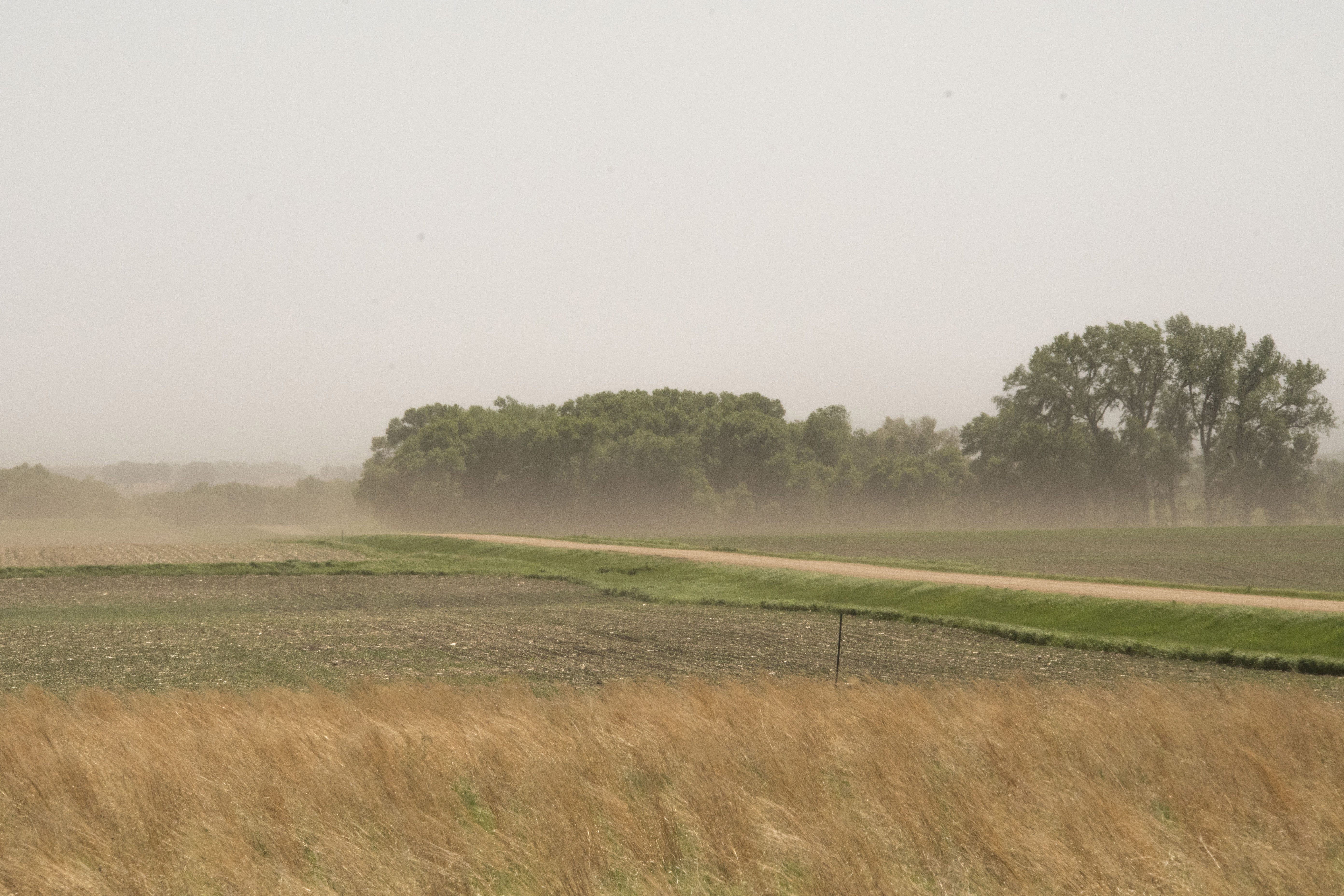 Those visible dirt particles were bellowing upwards of a couple hundred feet. With gusts up to 50 mph a brownish “fog” kissed the near horizon. Make “horizon” as just down the road not even a mile distant. And those light tan spots poking from the former prairie? Those tan spots of ever-growing exposed subsoil? We’re simply watching them grow, inch by inch, acre by acre, year after year.
