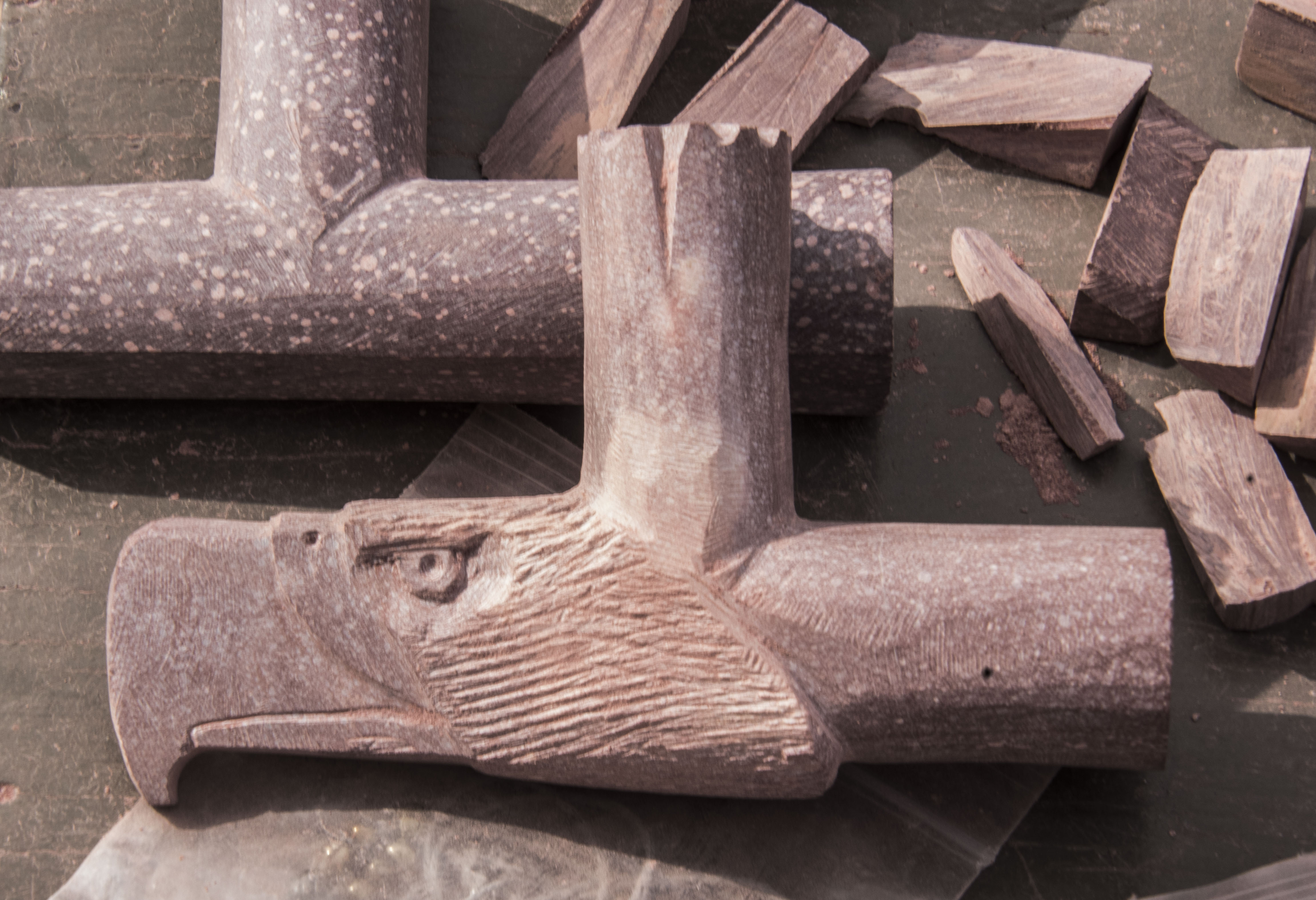 Though it was a warm afternoon, Travis Erickson preferred to straddle his dusty work bench “saddle” and use his sharpened rasp on the reddish pipestone he was perhaps “releasing” one of his eagle effigy pipes for which he is known, some of which are on permanent display at the Smithsonian Institute in Washington, D.C. “It was too muggy inside,” he said of the demonstration pods located inside the Cultural Visitor’s Center at the Pipestone National Monument.