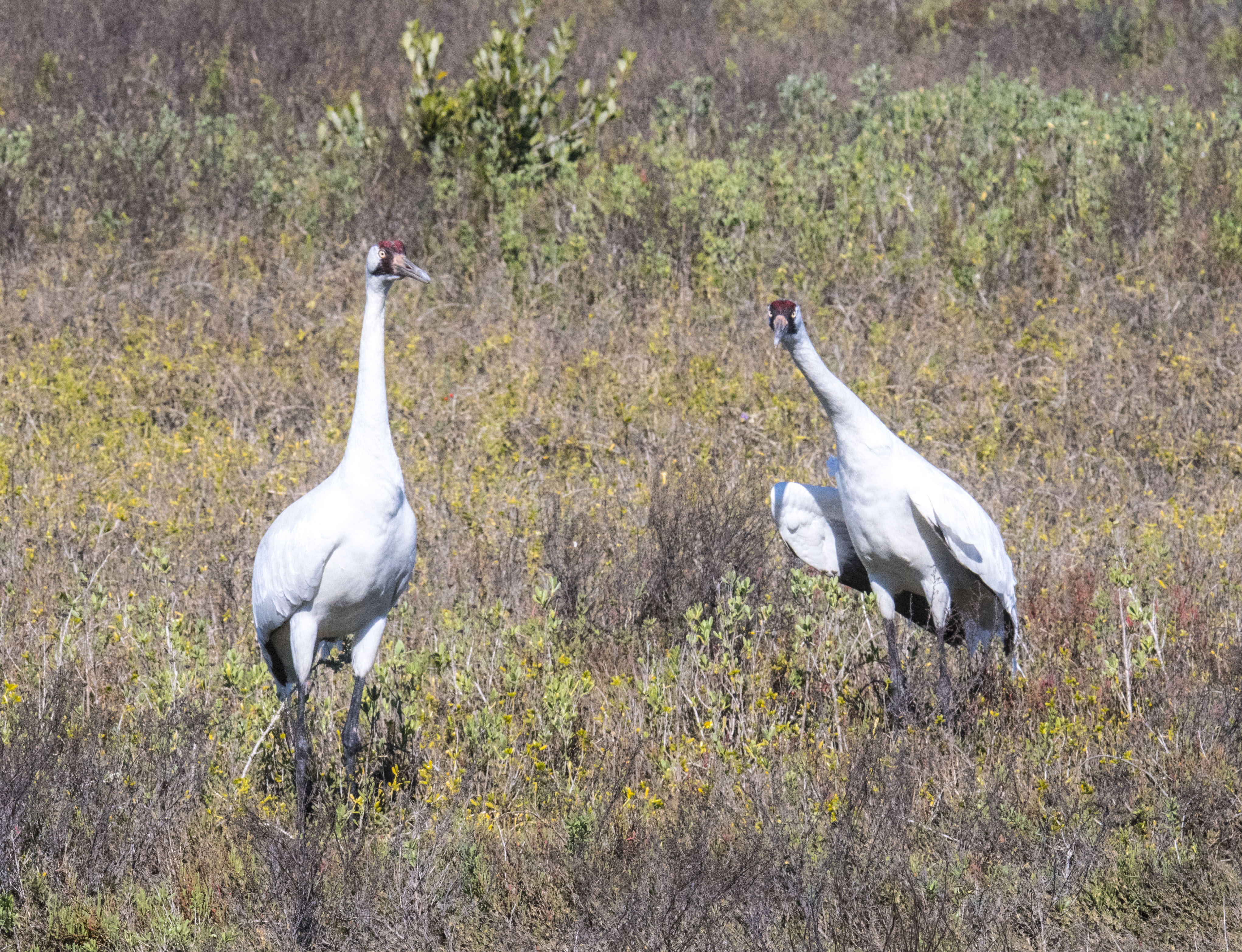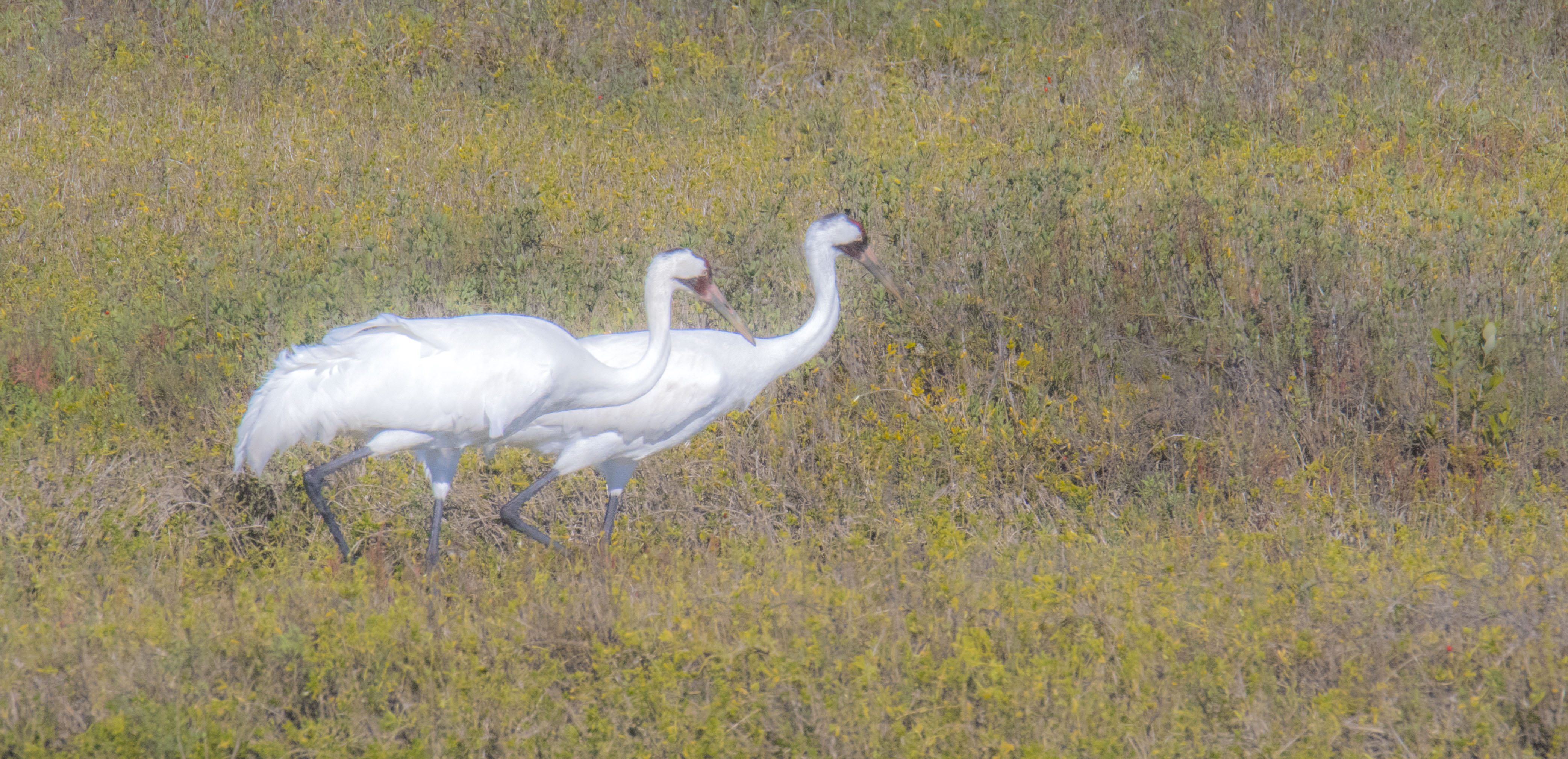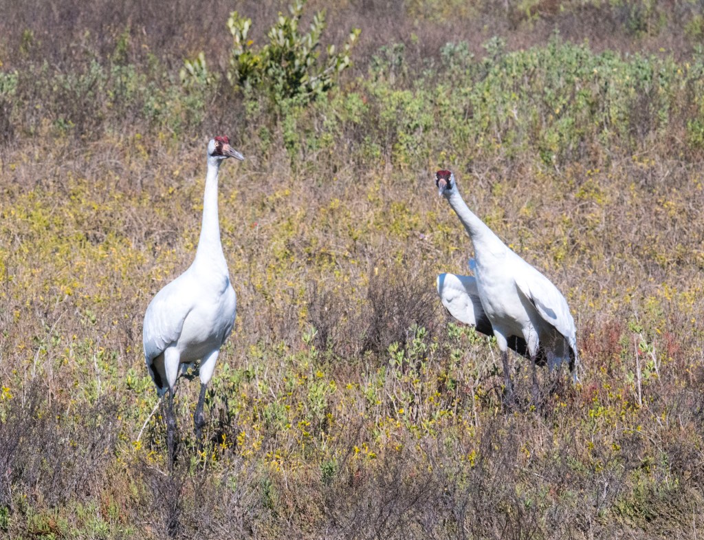 At Aransas, though, we boated into a completely different experience. After leaving port and motoring through the brackish bays, where we saw everything from Roseate Spoonbills to Oystercatchers, and almost every wading bird in a guide book, we reached the remote islands. Off in the distance, perhaps a few hundred meters away, we could see the white from a pair of Whooping Cranes. While this created a buzz among us on the launch, the best was yet to come. Further along the way a pair was traipsing through the marsh grasses just a few hundred feet away. The boat captain pushed the bow into the bank and cut the engine. Even he was surprised. “We never get this close,” he said, in amazement.