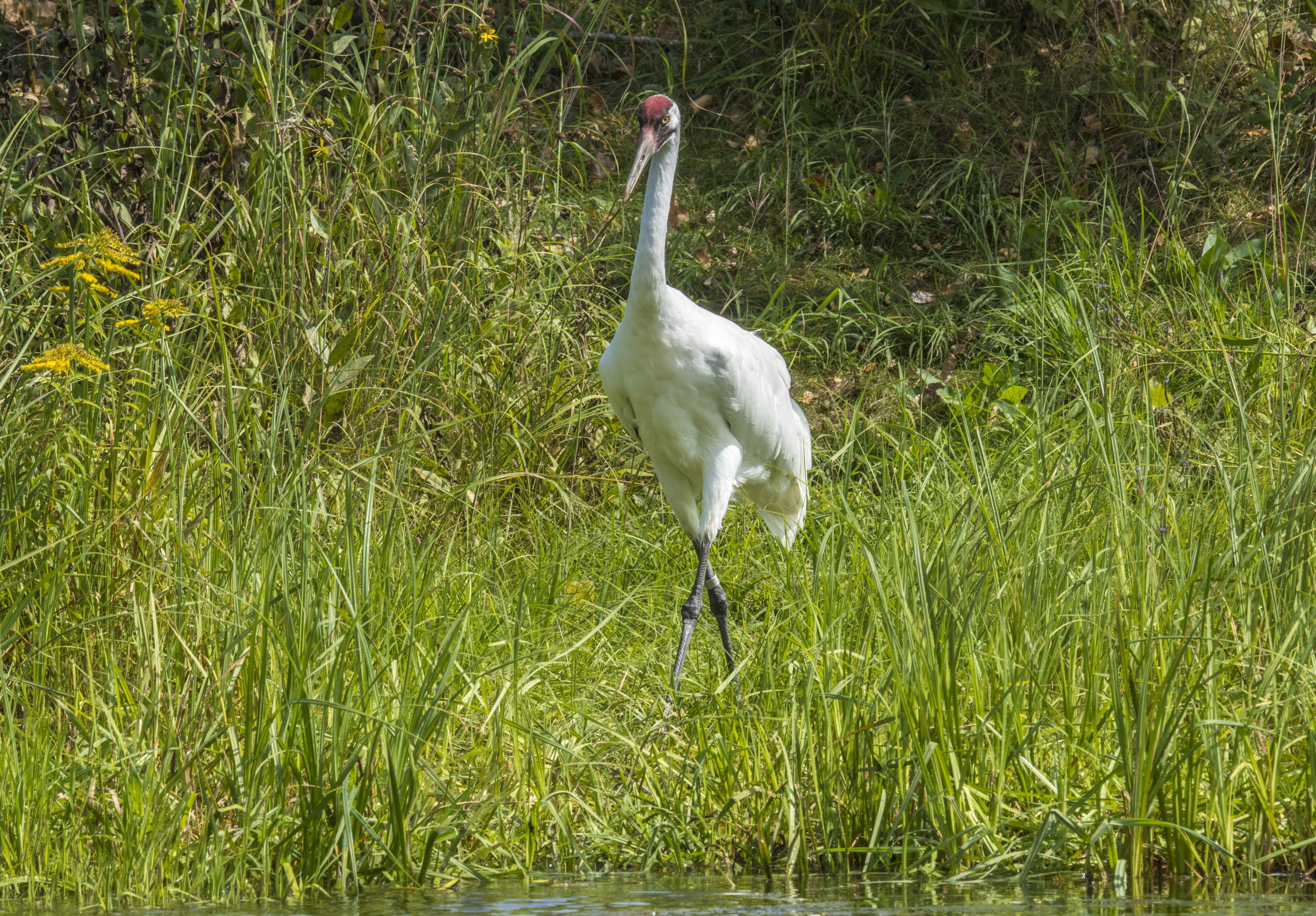 Greg’s plan worked wonderfully, and we had no problems finding the birds as the noise was nearly deafening. The gulch was of soft sand and stealthy quiet. Trees lined either side creating a tunneled path separating fields on either side. He held up his hand for us to stop, and we eased toward the west bank to peer through the dense foliage. Directly in front of us were countless, magnificent grayish birds with the reddish heads. Many were hopping around in their unique mating dance. Then something caught my eye that was different. Something tall and white right in the midst of all the hundreds of sandhills. Yes, my very first Whooping Crane! Although these were my first sandhills, seeing an actual Whooping Crane was an amazing experience back then when the count was somewhere below 100 in the entire world. The whoopers were on the verge of extinction.