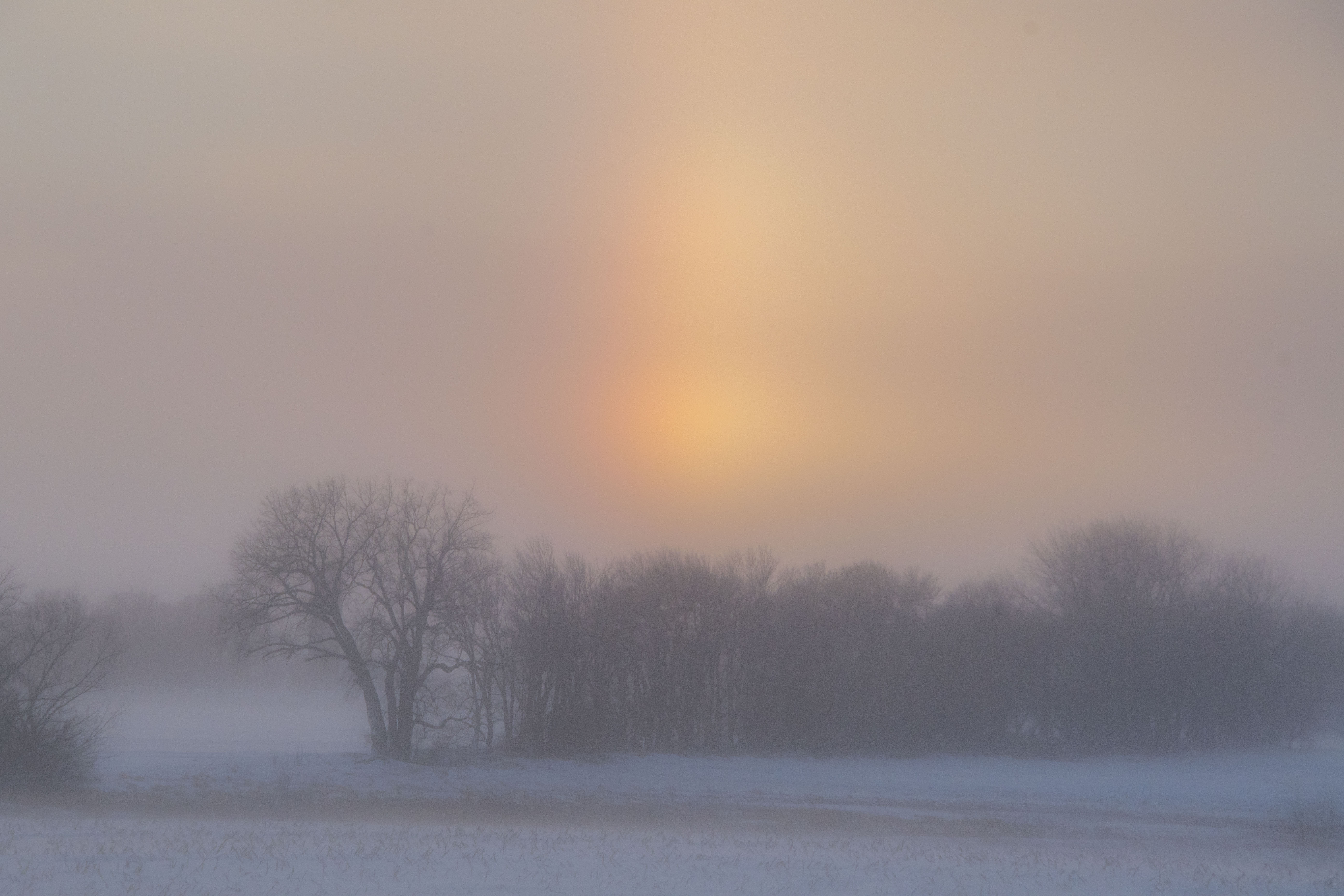 Barely visible through the whitened snow blown haze are the rainbow-ish outer arcs of an icy halo commonly called a Sun Dog, or parhelion. Seeing one typically reminds me of a photographer friend who had flown in from the Netherlands, who as we drove across the frozen prairie on a day not unlike this one, though minus the wind blown haze, became mesmerized by a Sun Dog. I pulled over and she climbed out of the warm car into the frigid air to take photographs. Indeed, she still has a print on her apartment refrigerator outside of Amsterdam. She wasn’t out long, and later claimed to have never been so cold.