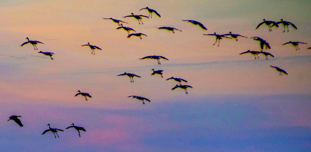 A full moon has risen here over the prairie reflecting flecks of snow swirling in a brittle breeze. Depths of our long winter. Now in the middle of February with spring feeling so ever distant, word comes that one of the highest number of Sandhill Cranes have already arrived along the North Platte in central Nebraska. This high number of Sandhills are more typical in the first or second week of March, according to an ornithologist with the Crane Trust.