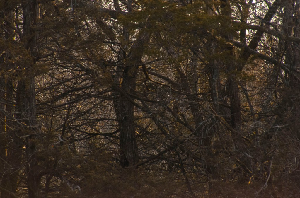 Contemplation over much of nothing comprised my morning, which was chilly enough without activity yet warm enough under down outerwear that there was no shivering. Watching a morning awaken is a delightful experience especially in a prairie meadow surrounded by dense wood. A few times I would see something of interest and shoot a picture. Tom intermittently worked either his slate or squawk box, though the answering had long before stopped.