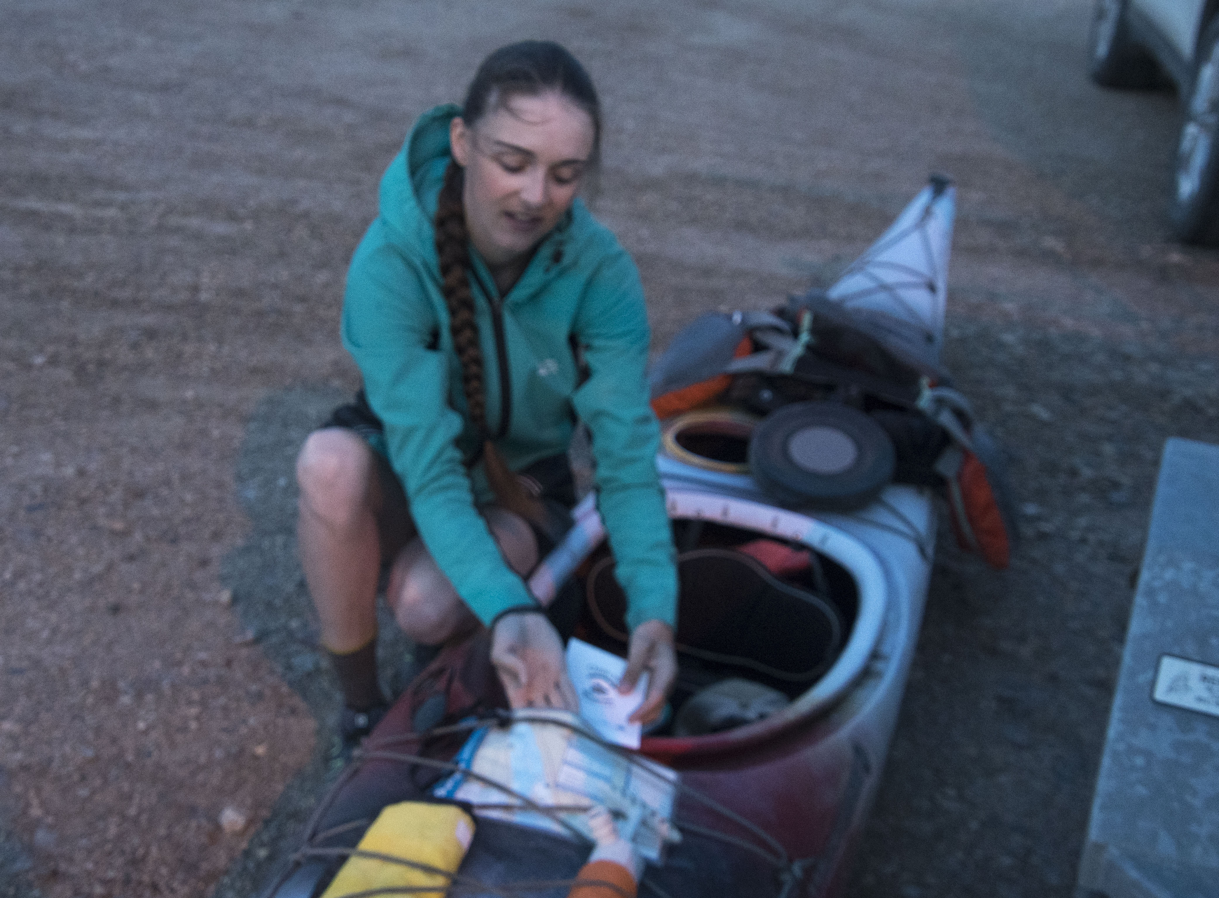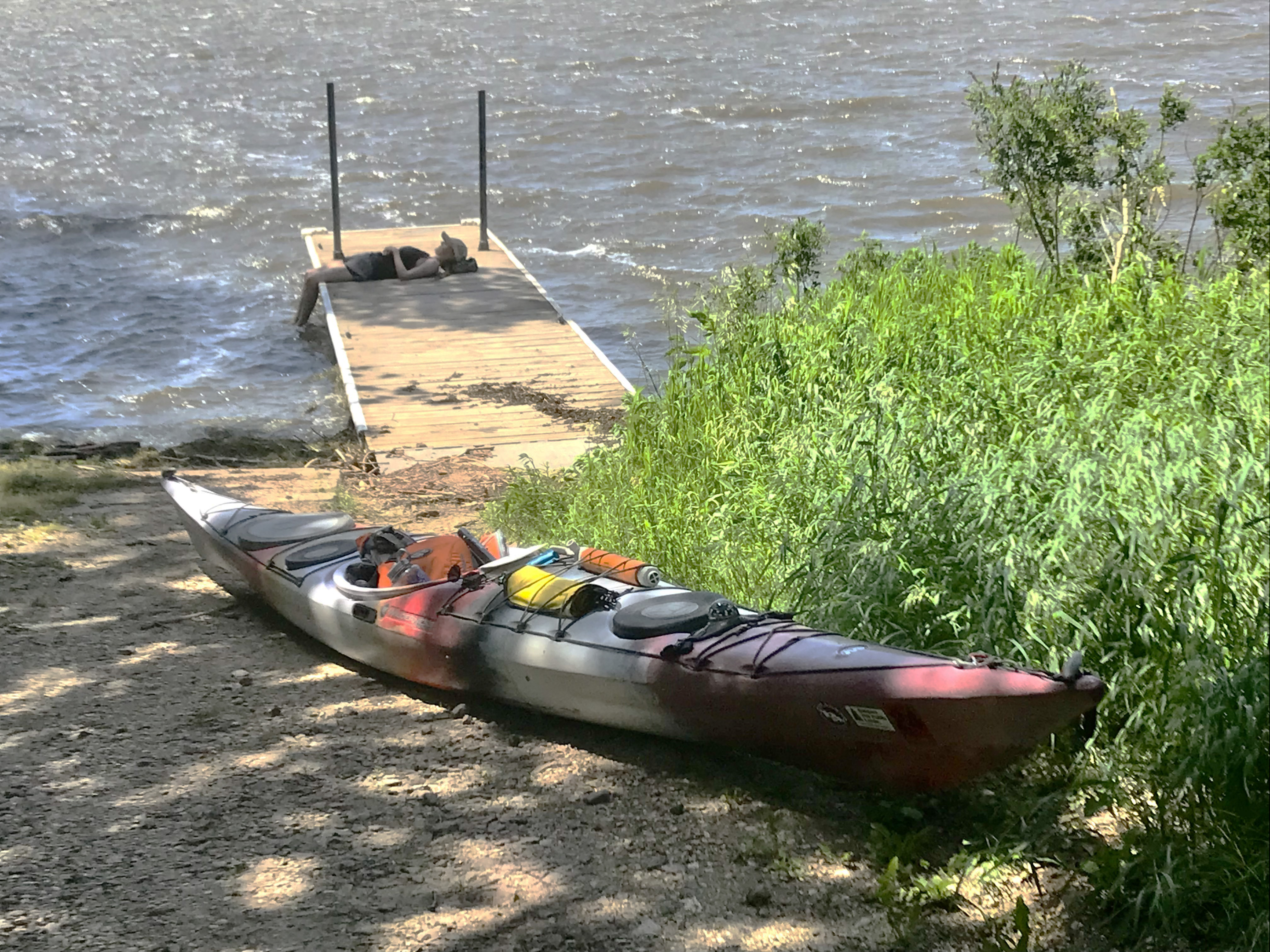 Eklund claims she’s been a paddler most of her life while growing up in rural Eastern upstate New York near the Vermont border. A kayak paddler. “So when people ask why I’m using a kayak instead of a canoe, it’s because this is what I’m comfortable paddling,” she said. She somehow packs her supplies in waterproof bags that she stores in the portals, behind her seat and between her legs. She is an economical packer.