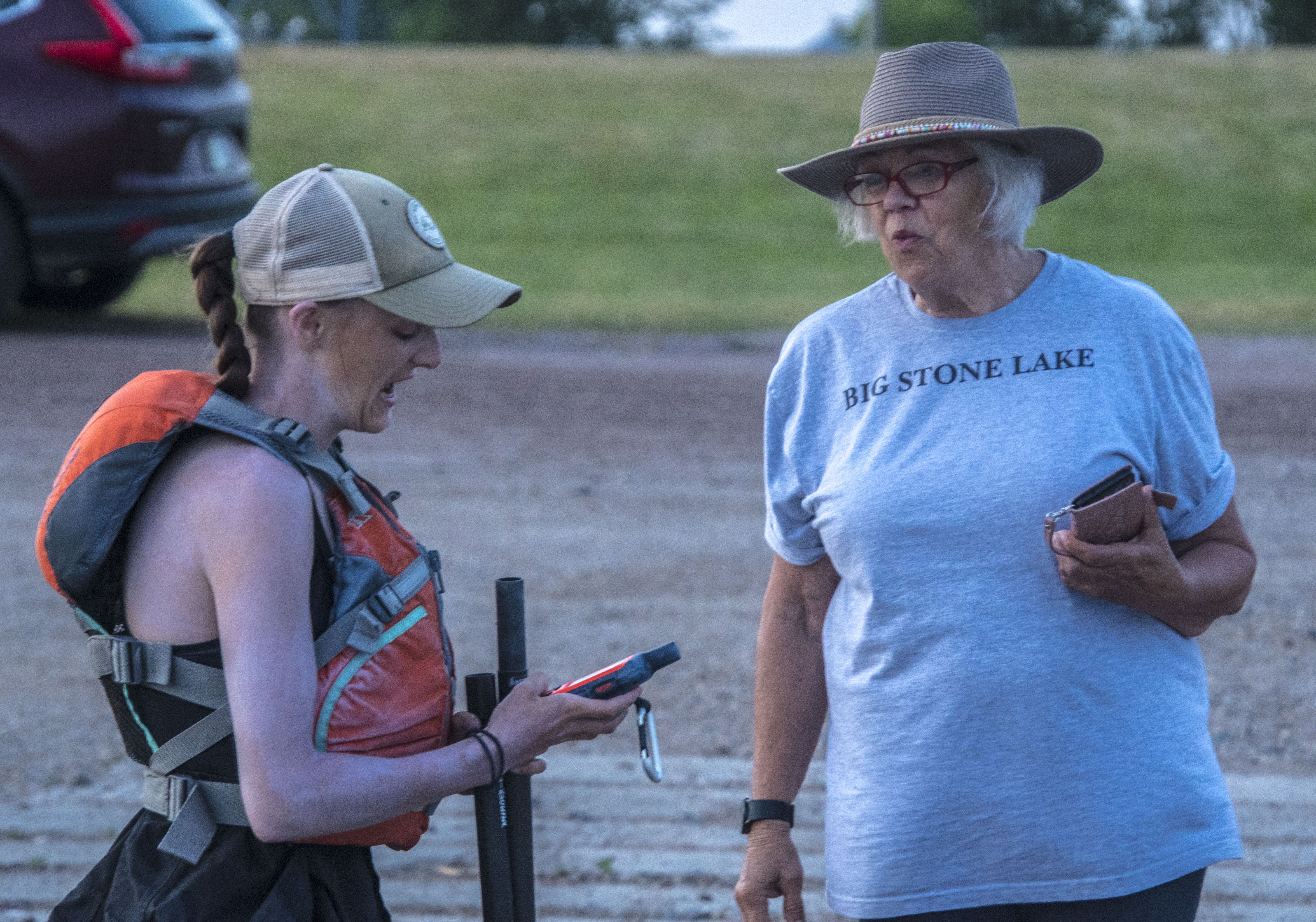 It was actually through an old “river rat” community that led her to Listening Stones Farm last Saturday. I drove down with my canoe trailer to meet her at the foot of the Big Stone National Wildlife Refuge, then ferried her to her Big Stone Lake put-ins and take-outs starting around 4:30 a.m. on Sunday, and an hour later on Monday … all part of a strategy to beat the heat and high wind warnings later in the mornings. It’s been a wonderful experience for me, for I also have a connection with Natalie Warren. Warren has stayed here at the farm in the past, and once even loaned me the paddle that was branded at York Factory at the conclusion of her trip with Raiho. Eklund plans on taking a wooden paddle for the very same reason.