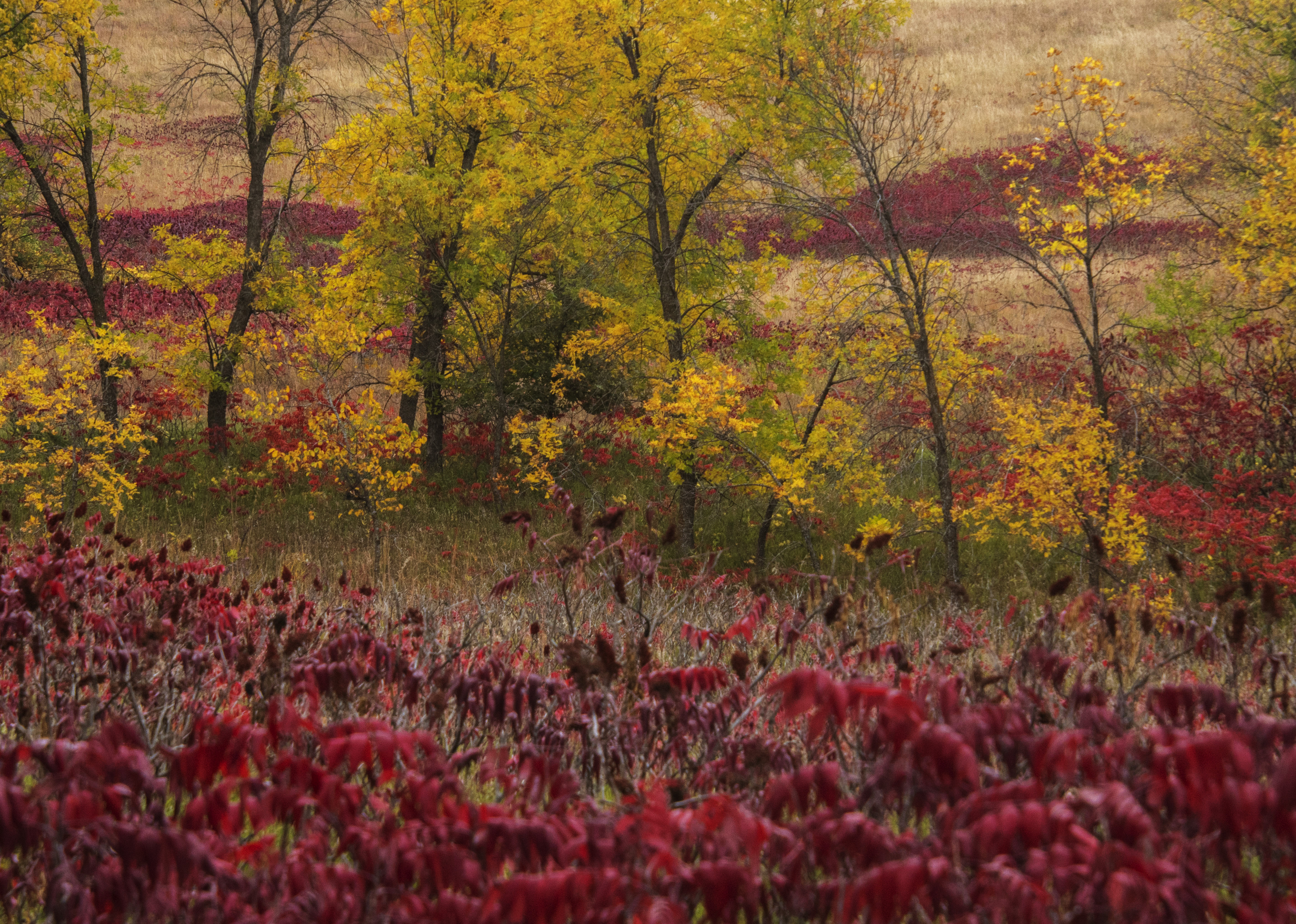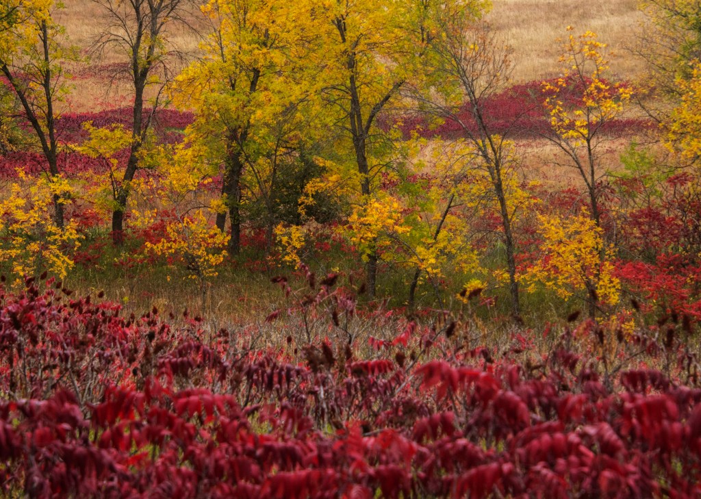 Eventually the inertia came to right myself for the rest of the hike which would take me up the hill into the sumac meadow. Here the sumac, ever invasive, spreads in a sea of autumn redness across the meadow with clusters dotting the distant hillside.