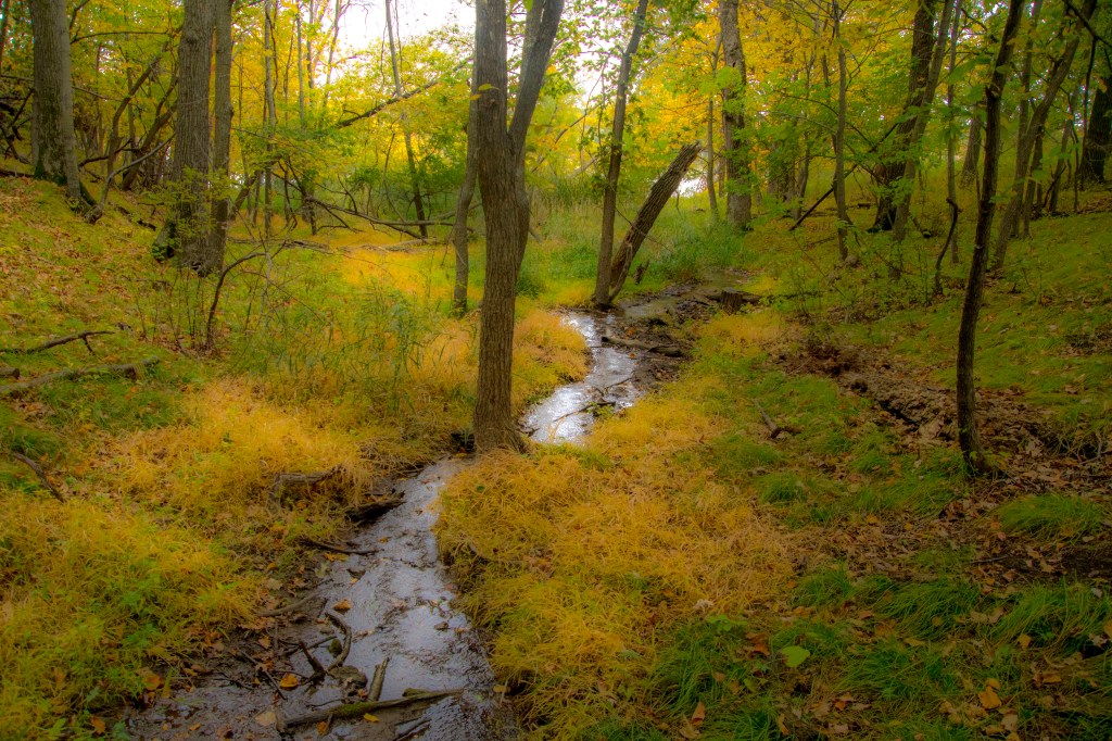 At the upper “lip” of the ravine, the reds from the sumac and yellow from the dogwood brought a lovely brightness to the otherwise cloudy day. I laid so the colorful horizon was in view so I could take in the color as well as the sound of the trickling waters. On rare occasions I will encounter another hiker, and I wondered what one might think of seeing an old guy laying on the boardwalk bridge, a camera at his side, with his hands clasped as a pillow behind his head. Perhaps he or she might come and sit, too, or maybe find the necessary space to find a similar prone position.