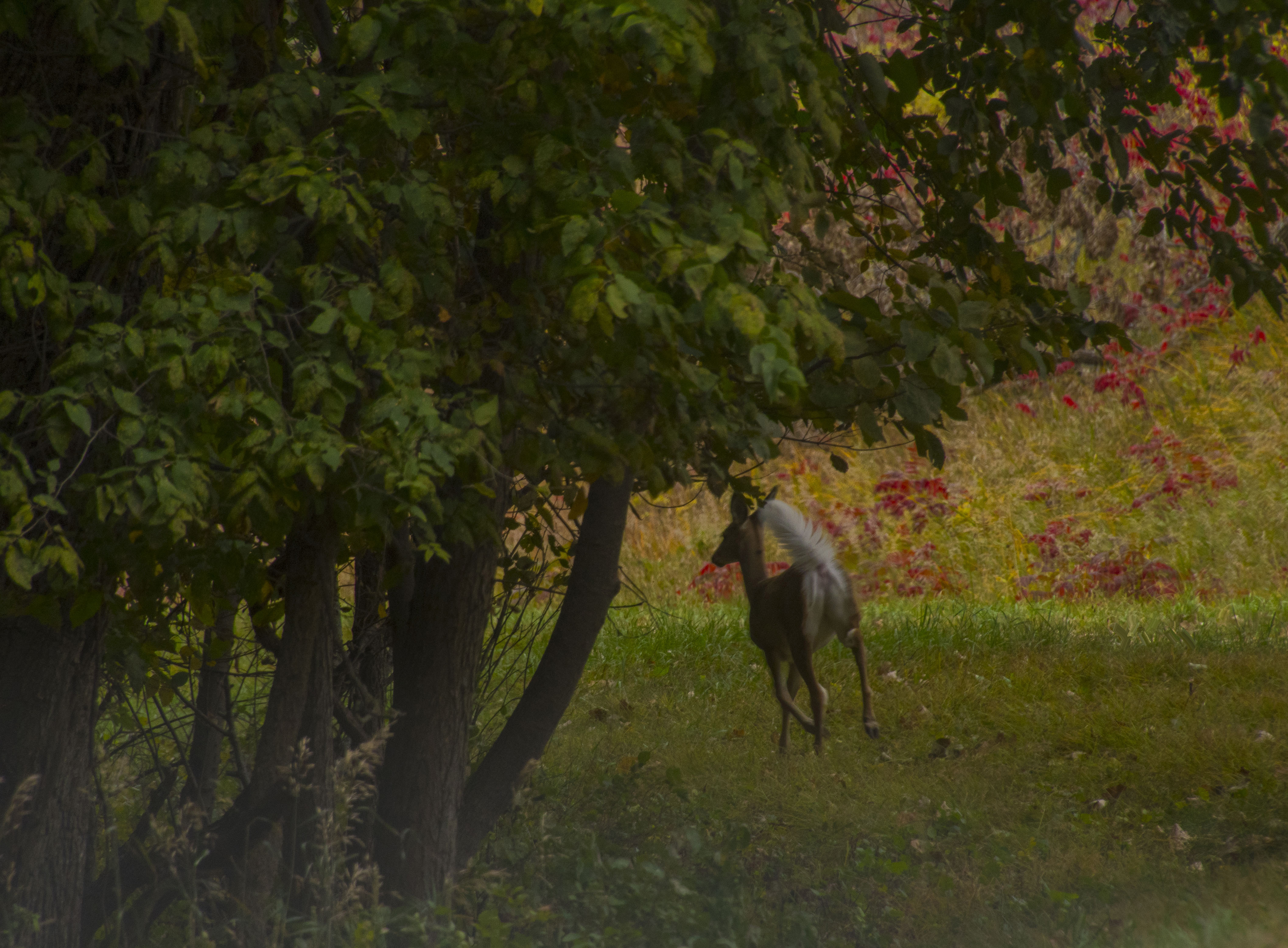 I kept my eyes coursing through the timber in hopes of seeing deer. Those “snapping” twigs were unrelenting, so chances were slim if not impossible. Not just any deer, for I wanted a nice, regal buck with stout antlers, ambling slowly along within lens view surrounded by colorful leaves. Later I would scare up a doe and her twin, nearly fully grown fawns, and luckily a couple of shots were made as they bounded away.