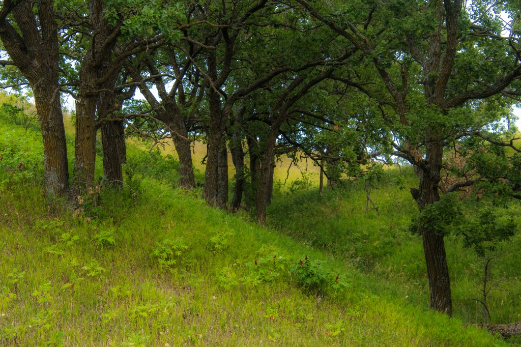 While this ravine is closest to Listening Stones Farm, being about two miles due south, it is also one of the longer ones in this area. On it’s southern bank are at least two small oak savannas, subjects of dozens of images. It stretches through the prairie for more than a mile further east, where another gravel road was bermed across its depths.