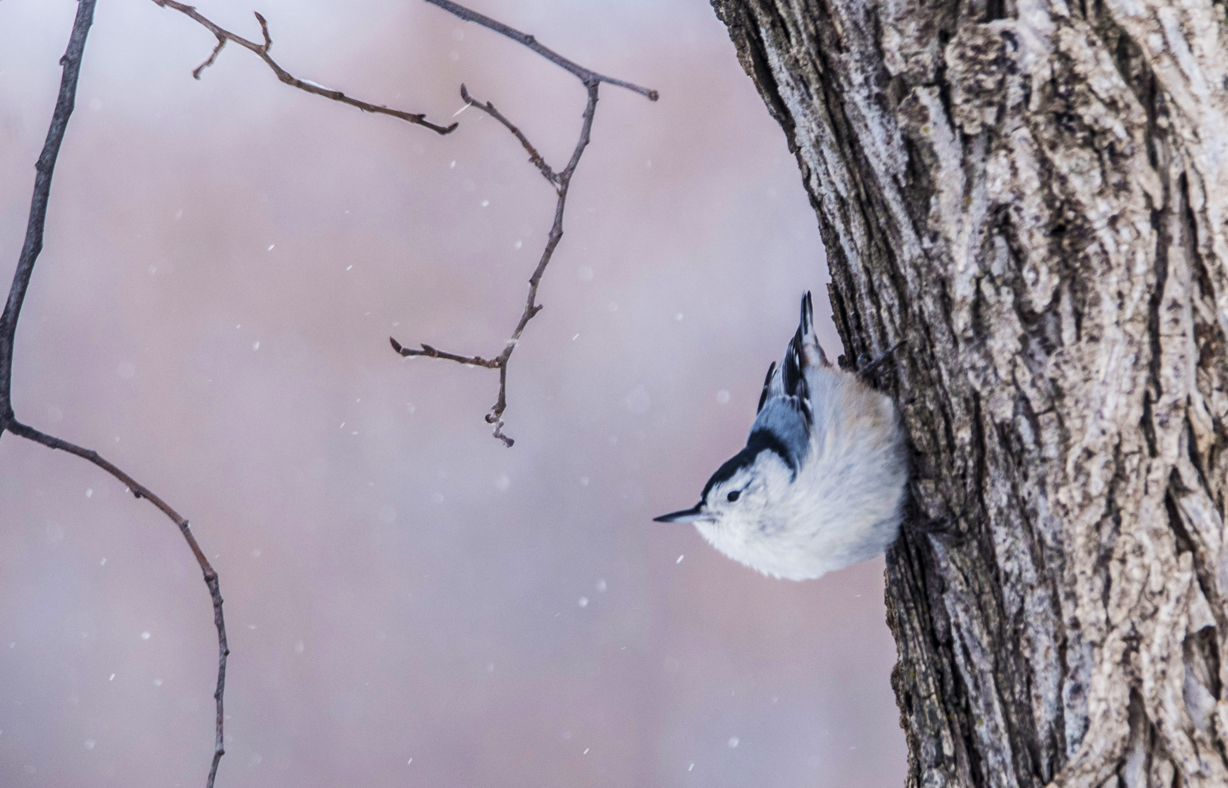 There were few birds, for most have migrated. On our drive I captured a rare bird of prey launching from a tree, and on the drive down we had passed fleeting snow buntings along the highway. Nuthatches are rather common and basically matched the terrain … white and blueish gray with a band of black. We saw numerous nuthatches and not much else.