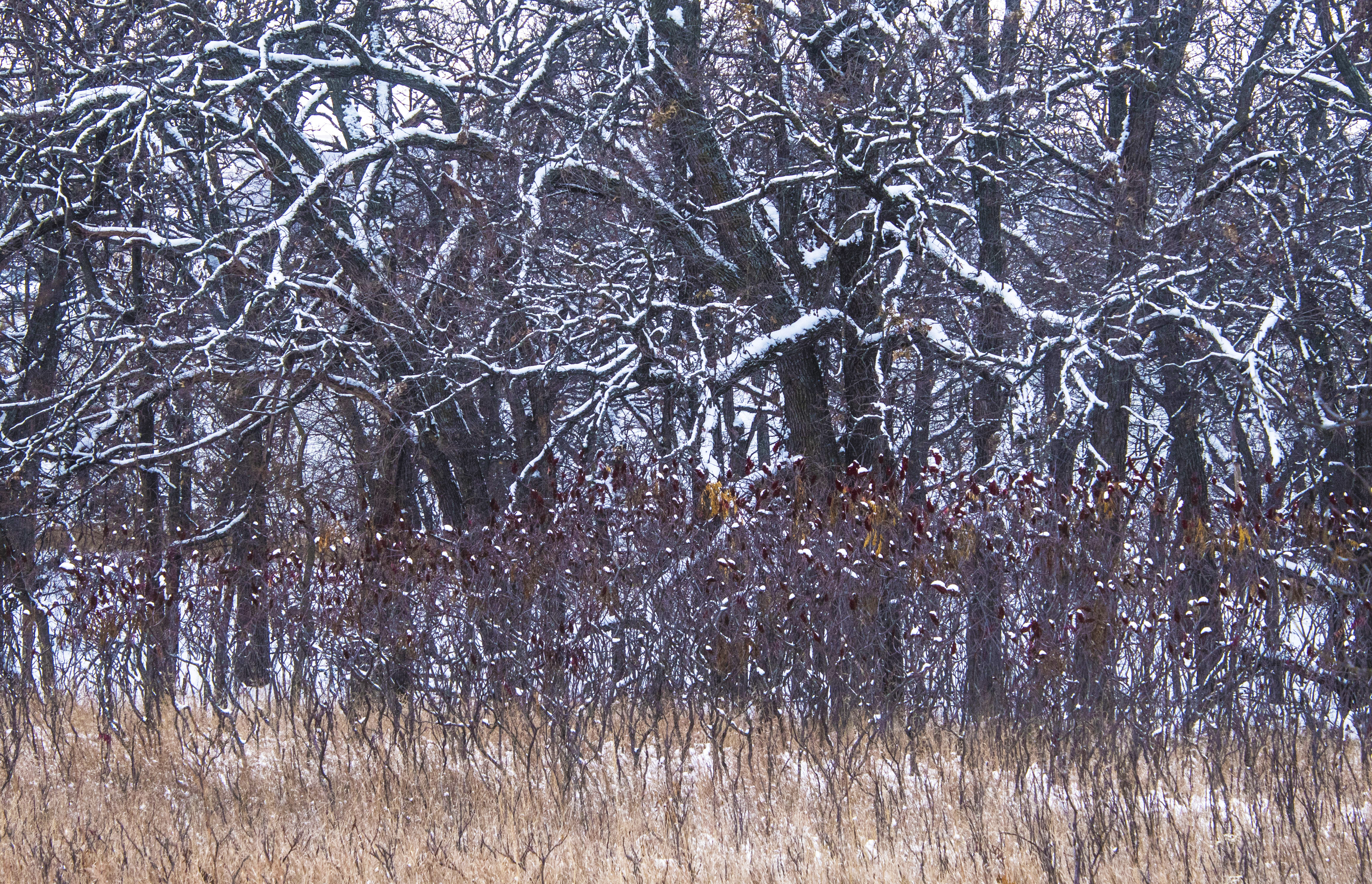 Thus far the treatment has been subtle though effective. Tonal differences in the prairie grasses have come through to replace a blazing and colorful sunset, for this blanket of seasonal … November … grayness has eliminated sunsets for most of the month. Later we sat on the couch watching a football game with an eye on the western sky ever hopeful for a break in the cloud cover. A hint of orange-ish light gave momentary hope. It was not to be.