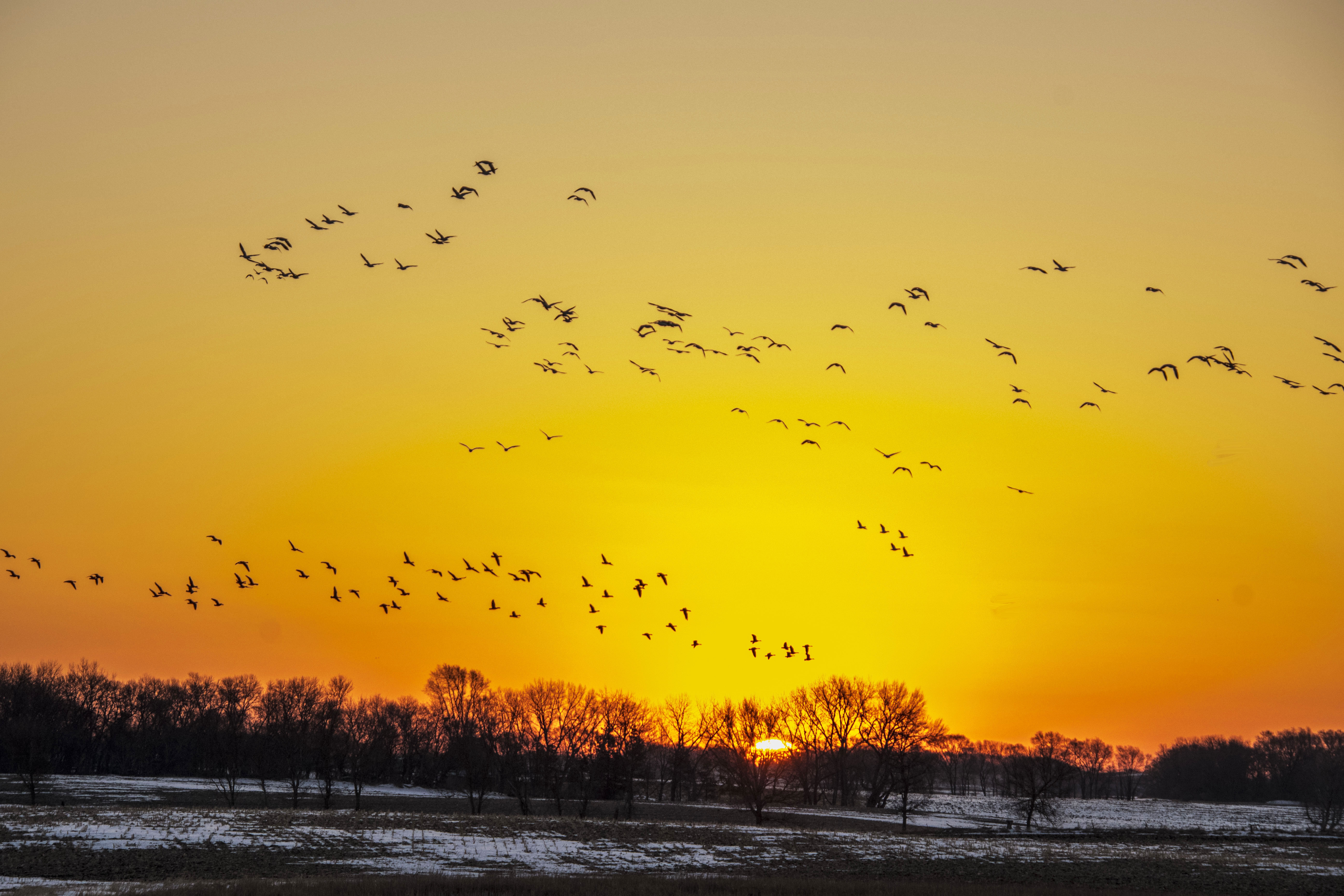 Finally, after many long months of winter, we are welcoming spiderweb skies. Next to the Sandhill Crane migration in central Nebraska, finding the migrating Snow Geese heading into the prairie wetlands is most compelling. Thanks to the scattered and perhaps uncoordinated skeins of the Arctic-bound black wing-tipped white and blue geese, they seem to spread across the skies as elongated and exaggerated spiderwebs. What a lovely sight!