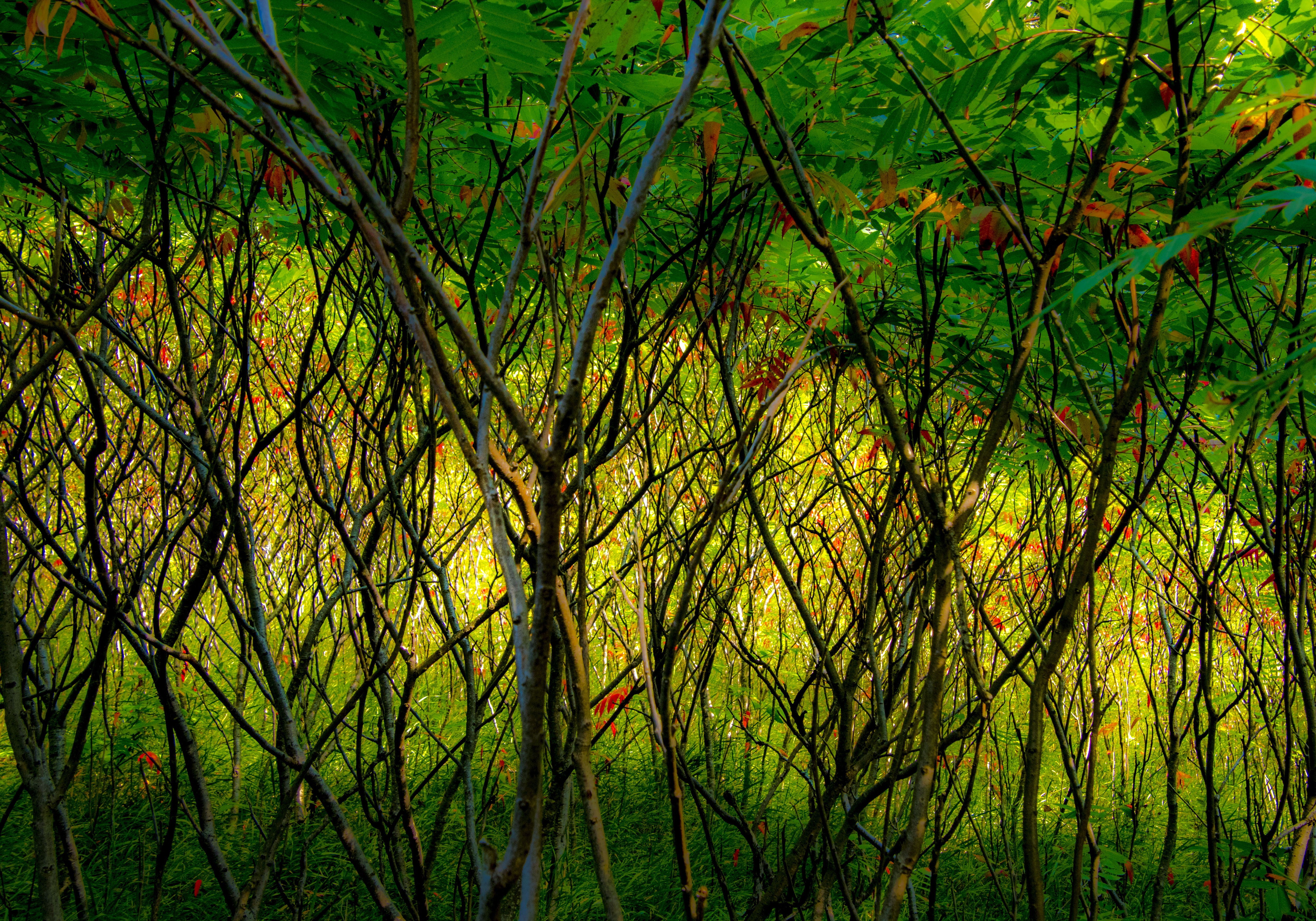 Elevating out of the ravine and up a steep hillside, we then encountered a huge acreage of invasive staghorn sumac. Lucy and I stopped to pull seeds from a remnant seed head to roll the tiny balls of succulent flavor in our palms with our fingers. The outer testa coatings eased from the seeds and were caught in the breeze to leave the hard seeds in our palms. Had we wished we could have ran our fingers over roughened tree trunks and broken limbs, yet the sumac seeds seemed to do the trick.