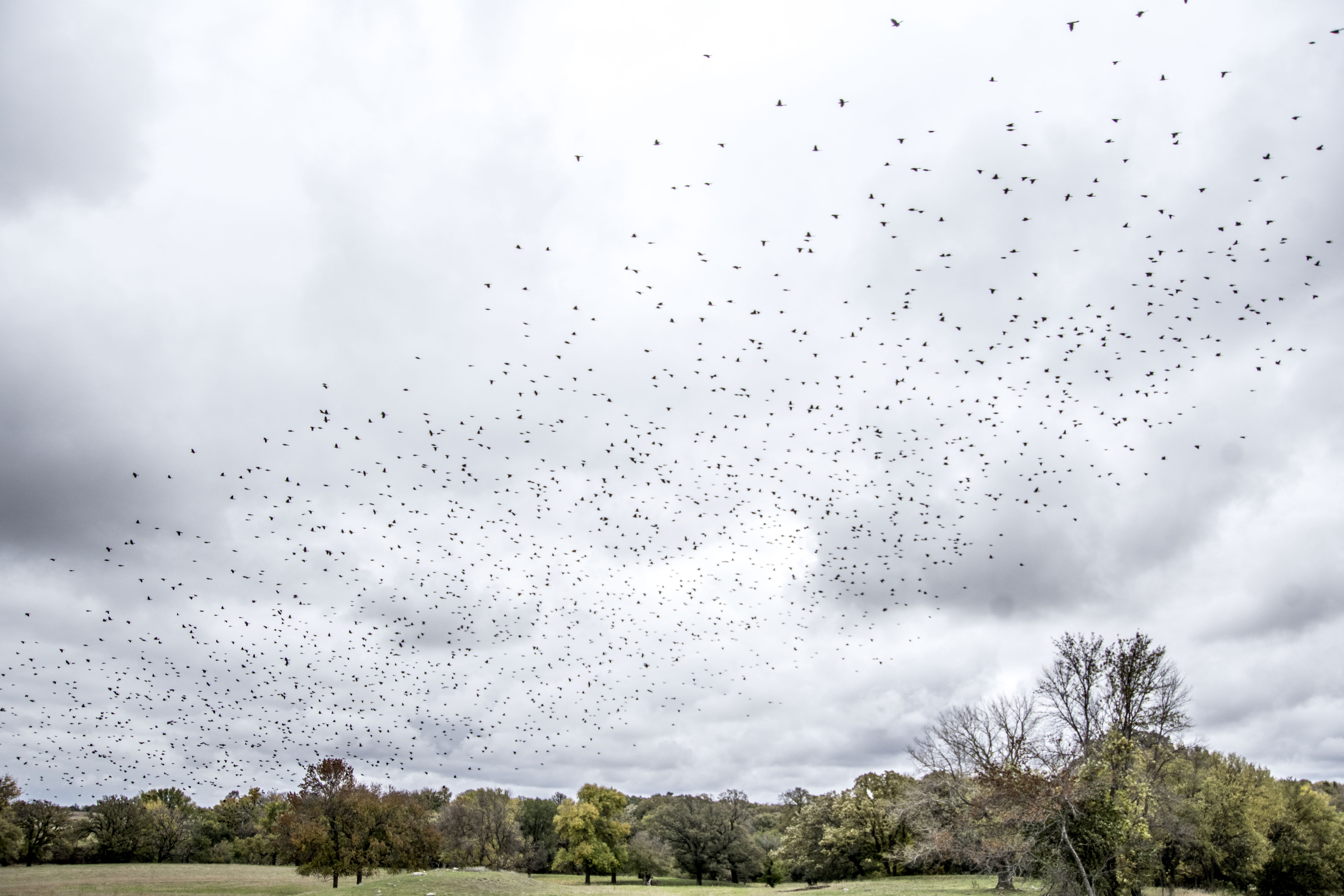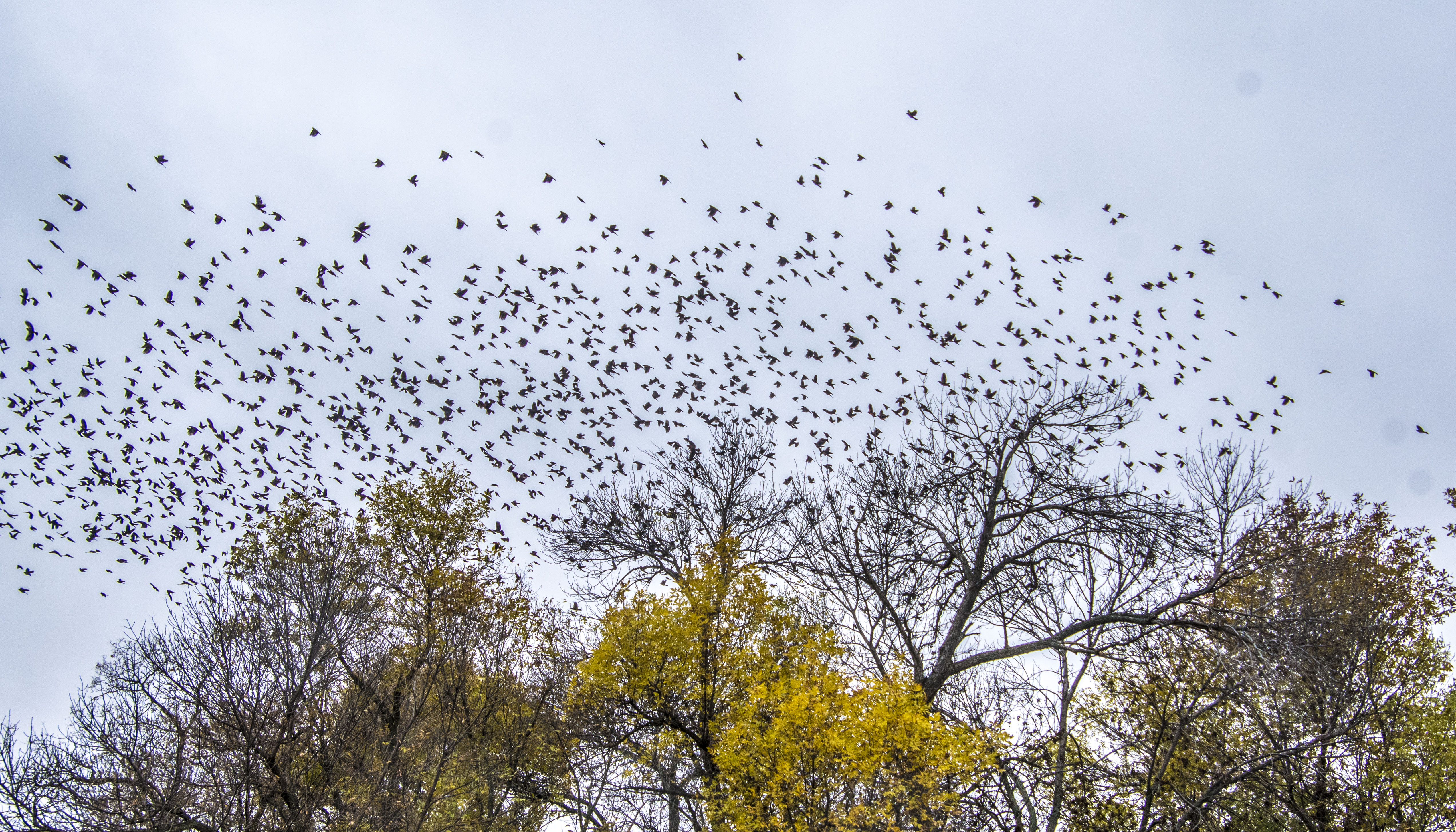 Another murmuration had settled in earlier yesterday morning, ever briefly, in the woods surrounding our home and studio. Leaning against the studio door to listen, the sound is much like what you might hear in a large stadium before a game as voices intermingle into a tangled and indiscernible murmur. This was at least our fourth murmuration of autumn, yet none were as large a massive one with thousands of birds we passed over the weekend nearly 90 minutes south on the King of Highways along the Yellow Medicine River outside of Ivanhoe, MN.