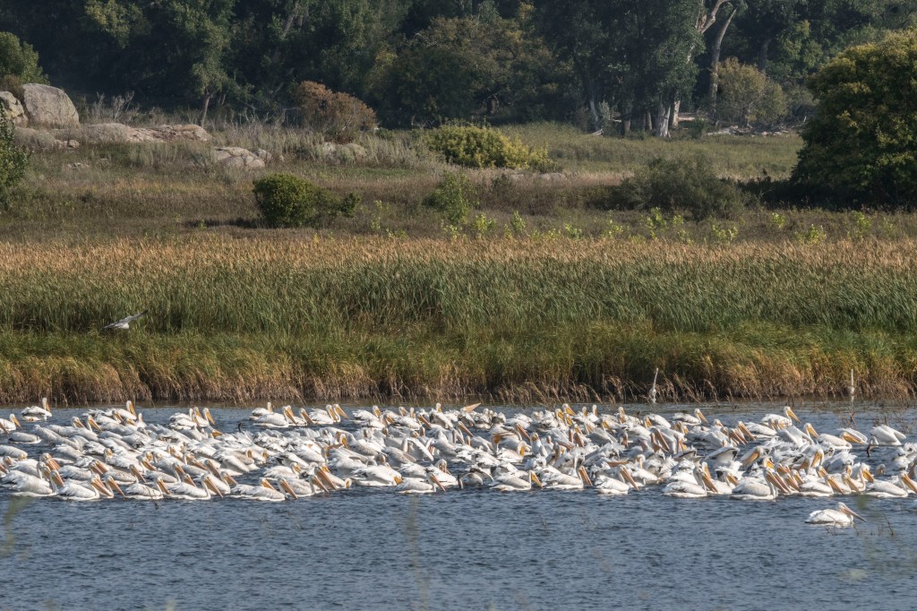 A few weeks before there was an uncountable number of white pelicans in the west pool of the Big Stone National Wildlife Refuge grouped together for what seemed like a quarter mile in length. Stacked up against one another so thickly they created what seemed like a feathery bridge some 50 feet across and stretching for a good 400 yards along the tall, marshy grasses. We’re fortunate to have the pelicans here through the summer, and I suspected as I photographed their collective long trough of a feeding frenzy that I was witnessing a pre-migratory feeding. By the next morning there wasn’t a single white pelican, save a straggler or two, to be seen. They were gone.