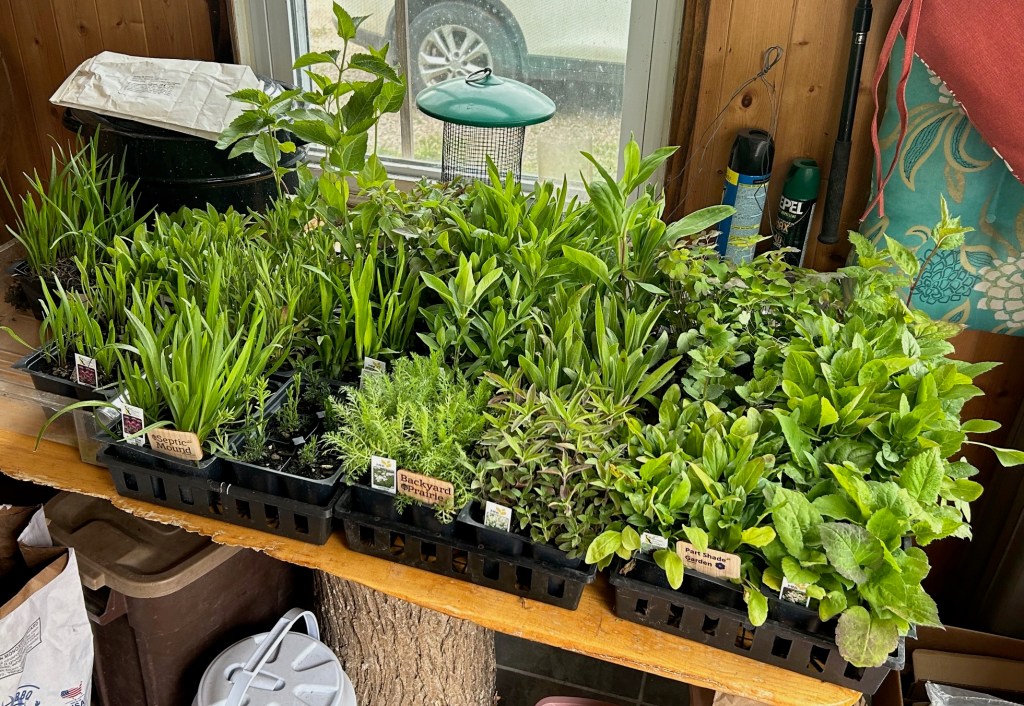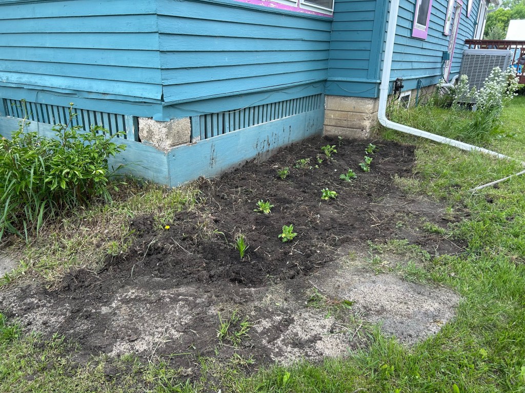 On our pick up day in nearby Madison, we drove down to retrieve the flats with what suddenly became an “oh, gosh, what now?” moment. We brought them home and placed them on the table of the mudroom as we gathered our thoughts. I would start with the partial shade thanks to having several volunteer red columbines hugging the side the house. Originally my goal was to plant an area above a rock terrace garden facing the road. Those columbines, though, offered quite an argument, so I grabbed a shovel and started digging out the grass and weeds while keeping the original columbines.
