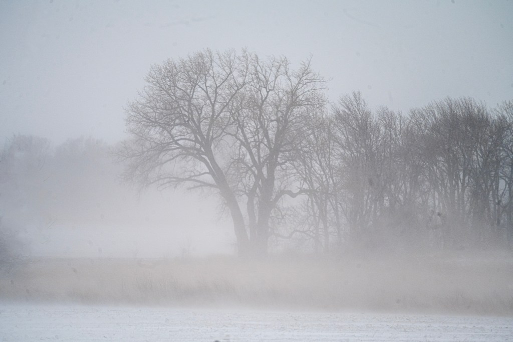 Beyond the edge and into the prairie grasses, the wind roars through the grasses and tickles the top of the canopy. Outside of the edge of the trees, just past Kurt’s perch, wind-driven snow nearly rolls in waves across the landscape. The fence row trees separating this half section from the neighbor’s field a mile to the east is lost in the whiteout.