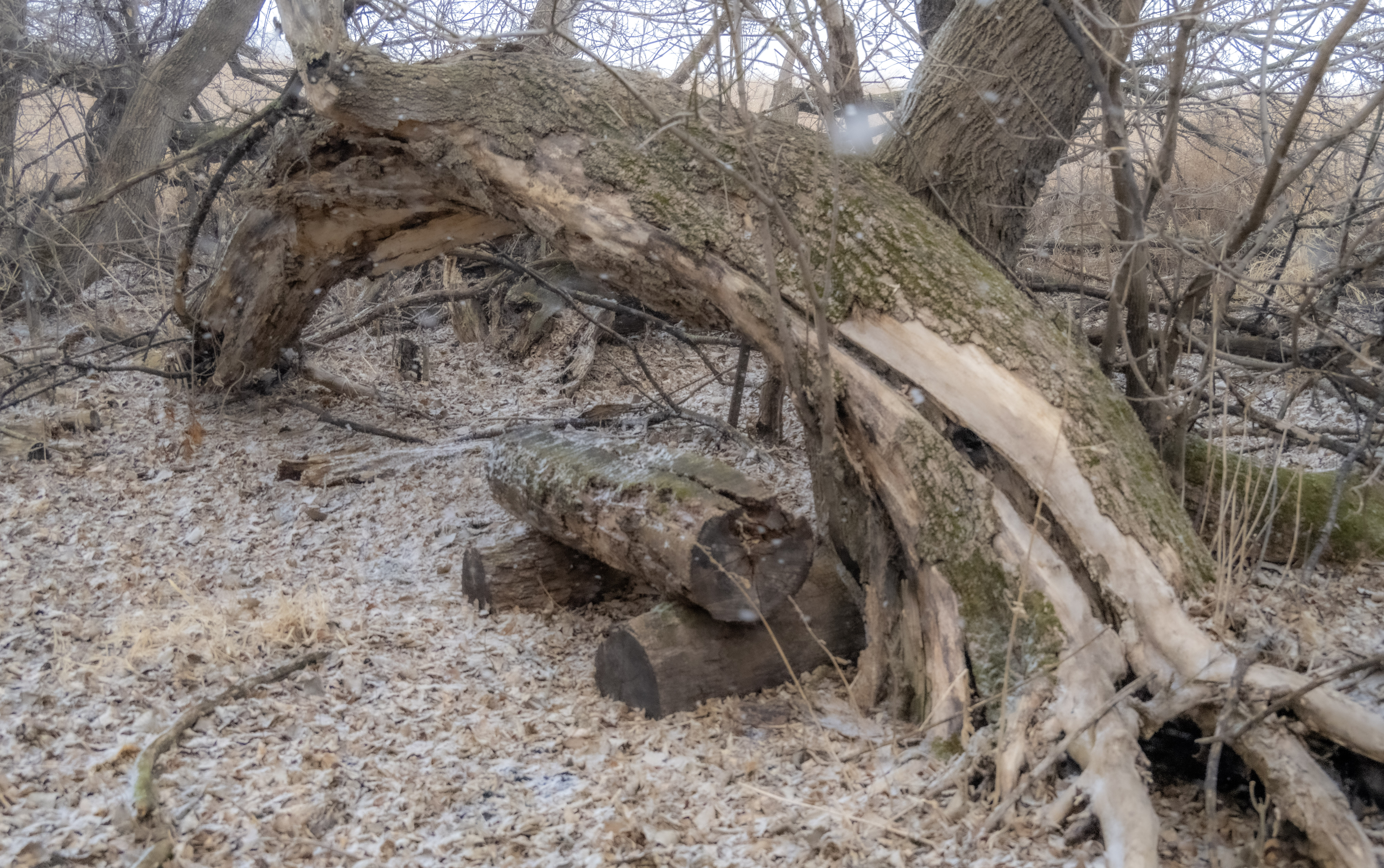 The blizzard was more than I had bargained for, so we cut a path through the seedless, wind-bent bluestem toward the woodland. Near the cover of trees we gained the protection we were aiming for. Just inside the canopy was my wood perch. A small bench of cut logs. The afternoon before, in near 50 degree temperatures, I had sat on the perch created by an old friend who back after we had purchased the land had come to clear a path through the grove. Now weathered and cracked, his artwork holds true, and his path is one we still work to keep cleared through the summer, and the one Joe Pye and I would traverse to escape the blizzard.