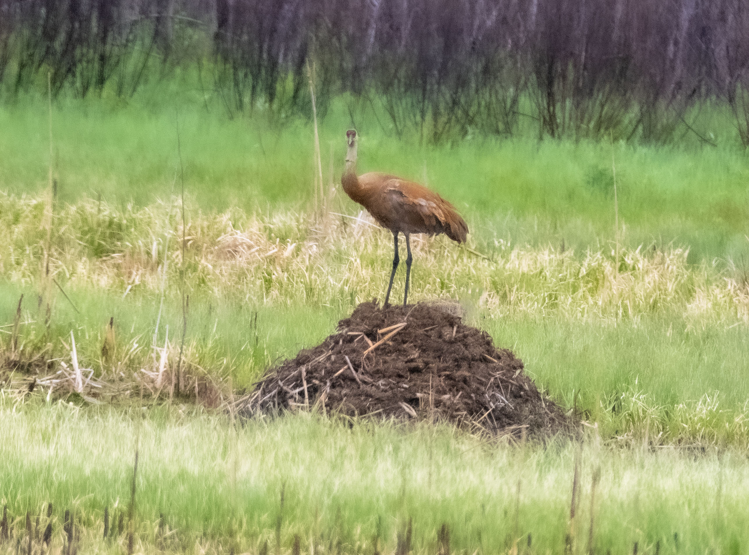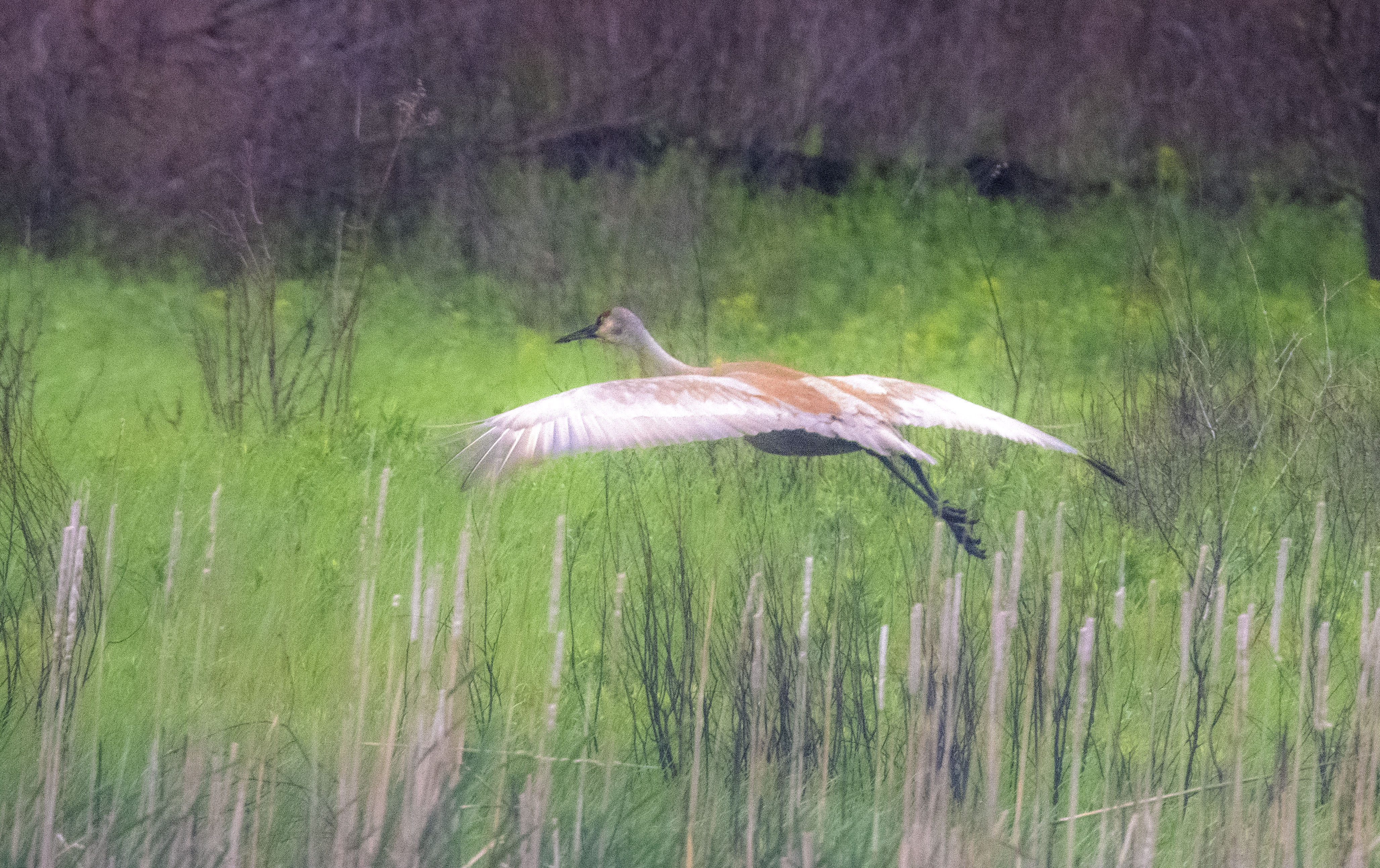 Admittedly, we were moving rather slow, fighting our initial disappointment of being past the halfway point without a single crane sighting. About then we spied a pair feeding near a far distant wetland. Too distant for a workable photograph. Then, suddenly, one flew across the road right in front of us and was caught mid-frame! Rejoice! Seconds later, its mate followed. Another smile. After that the crane sightings increased significantly, particularly on the due south straightaway of the motor trail where dozens were found feeding in a swampy prairie meadow. One even played “king of the hill” by standing erect on a muskrat lodge.