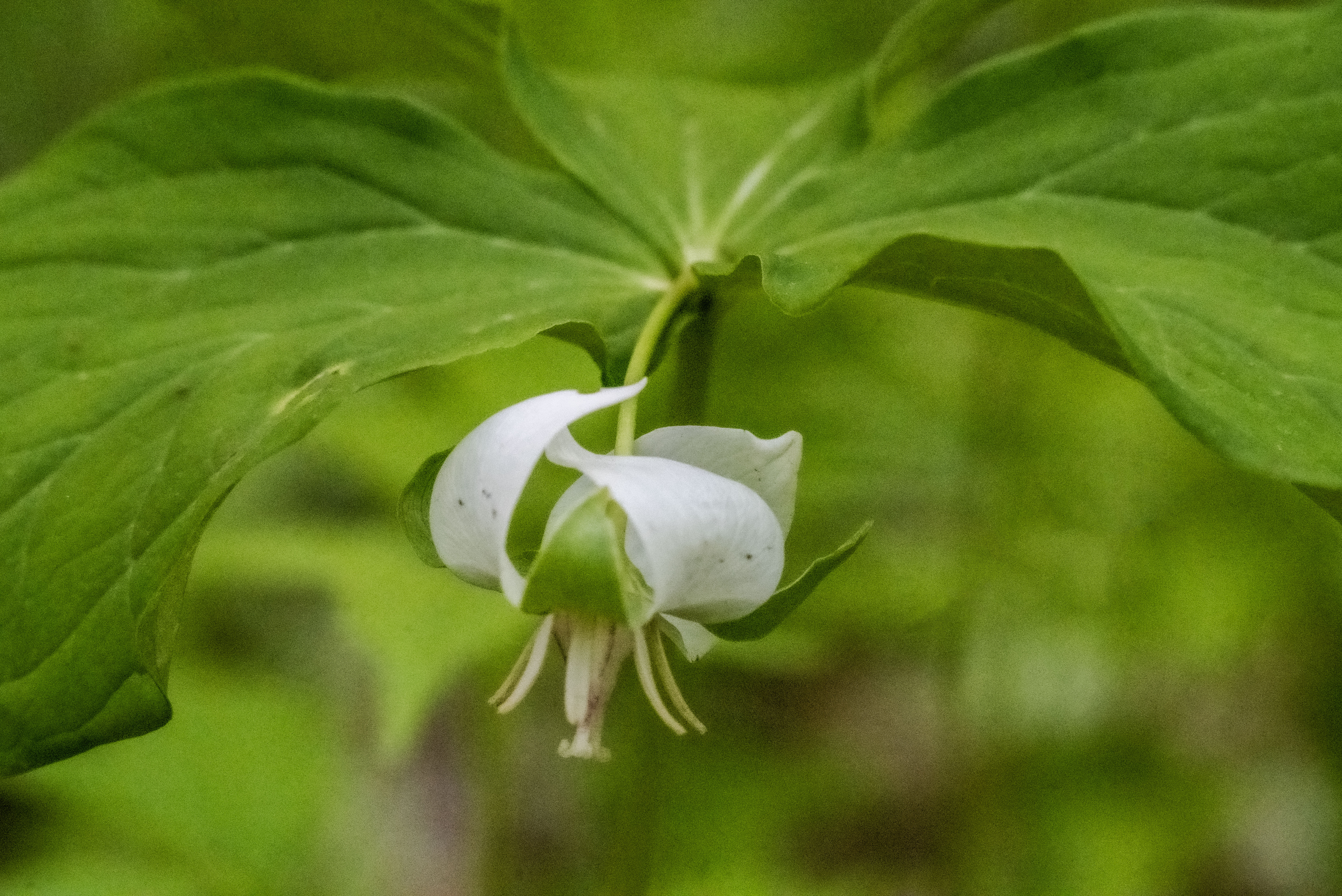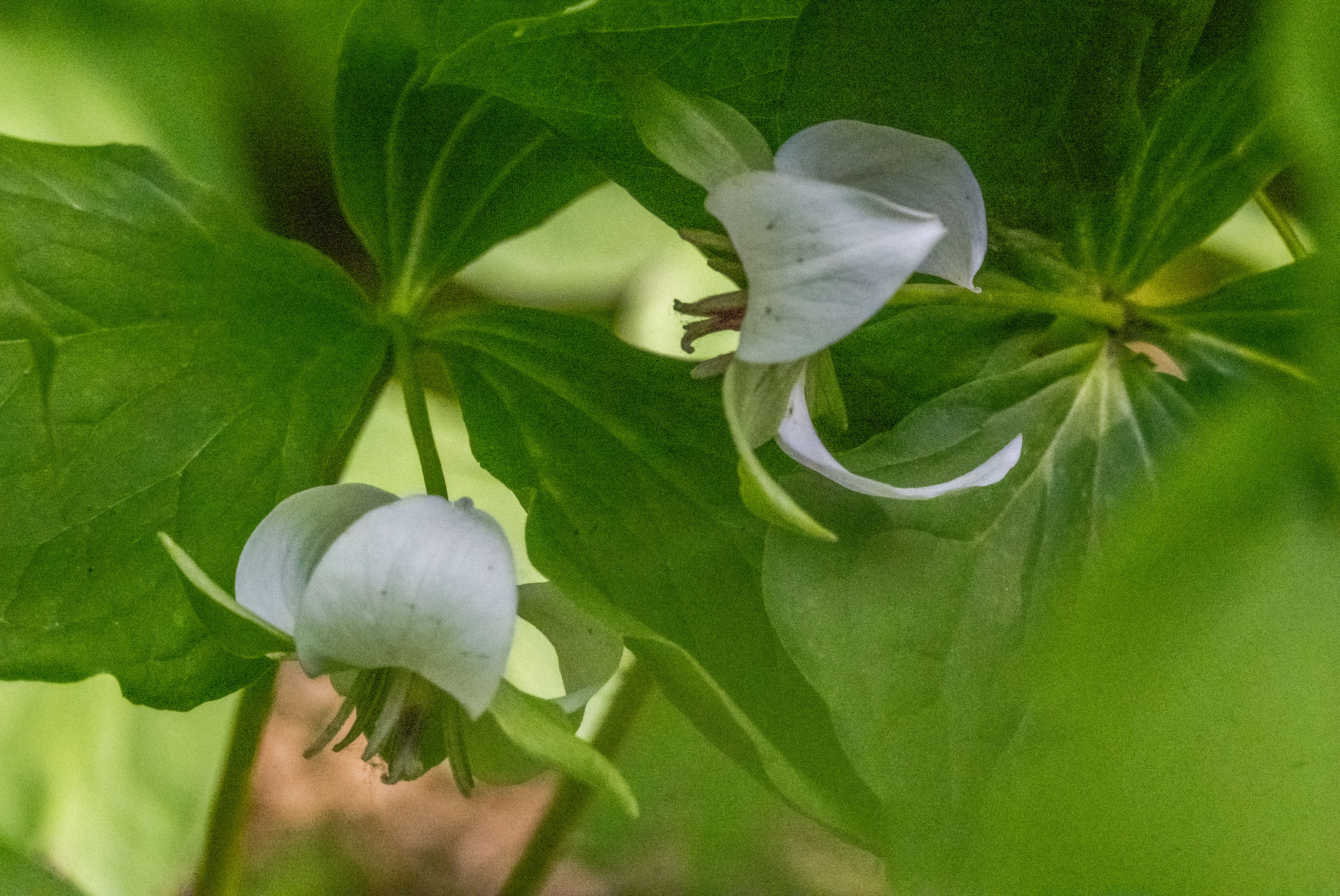 That was where we were when we encountered the two women and their dismal warning. Strangely enough, moments after our passing and further along the trail my eye caught some strange looking elongated white triangles clustered within the plant canopy. As I was focusing my lens Roberta asked, “Are those your Trout Lillies? Look underneath them.” Sure enough, for below those triangles were the characteristic yellowish, white tendrils. Nirvana!