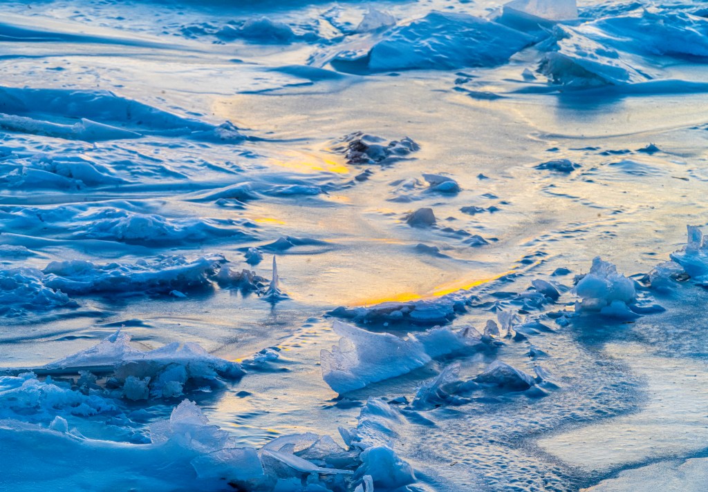 My initial idea was to capture the tinges of colorful ambient light of an afterglow on the roughened edges of the ice tips. When I arrived, though, there was an immediate realization that the river coursed sharply toward the northwest while the setting sun was a good 55 degrees due southwest. A high bank rimmed the river. The lowering sunlight wasn’t close to touching the ice, and wouldn’t.