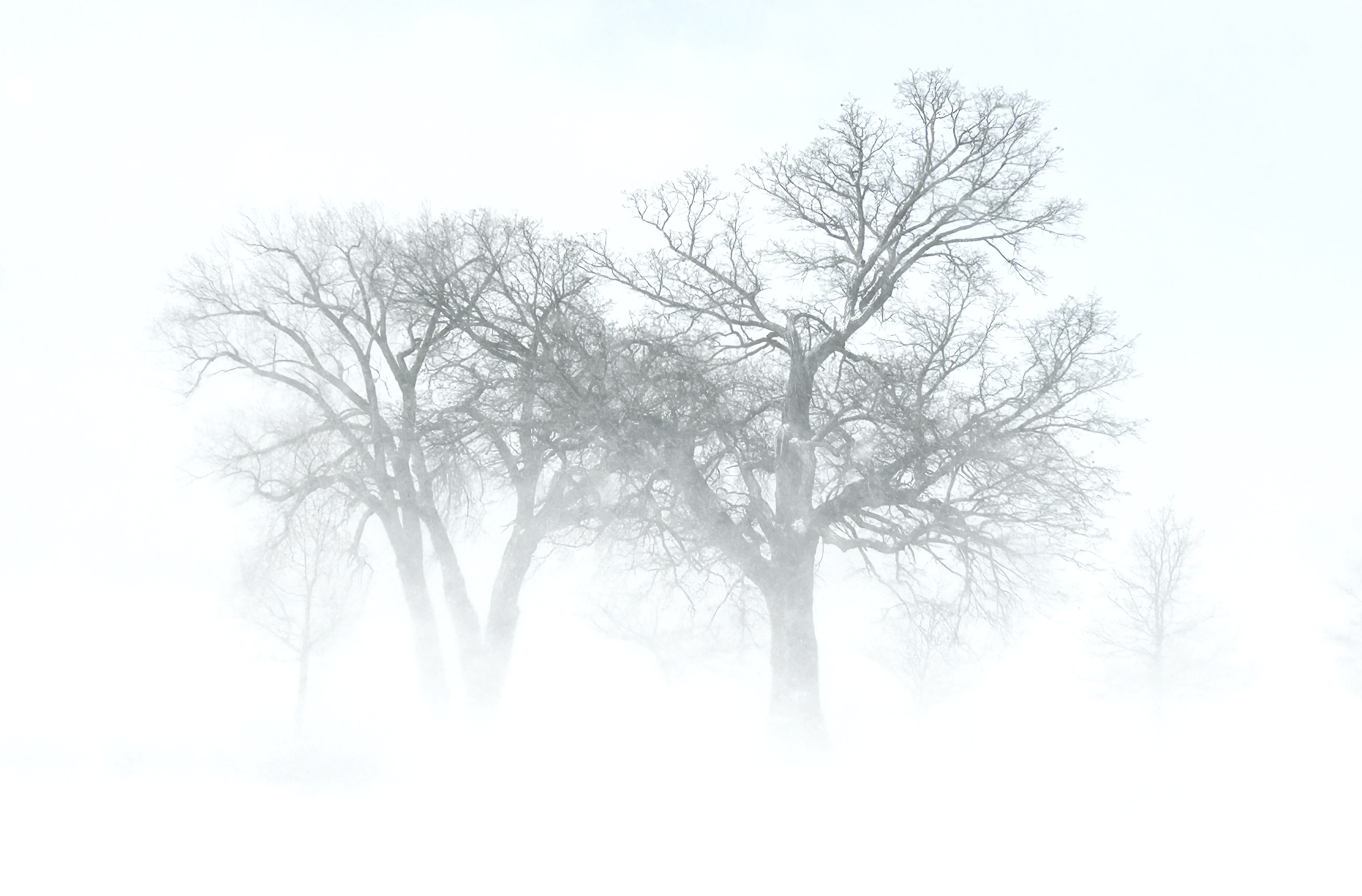 I’ve found a similar view of several nearby trees these past few days as mystic and barely visible views have momentarily peeked through this wind-driven whiteness. Prairie grasses have bent to the elements as the rasping particles of icy snow knifed through the matted vegetation. Birds hunkered low behind thick branches and leafy clusters, feathers fluffed in life-saving protection, hopefully with long enough soft quilts of down feathers to cover their bony legs as much as possible to prevent freezing. Some hide beneath our deck, too, with the feeders mostly devoid of even sparrows. Occasionally a nuthatch will bounce from the haze to quickly perch for a “happy” meal.