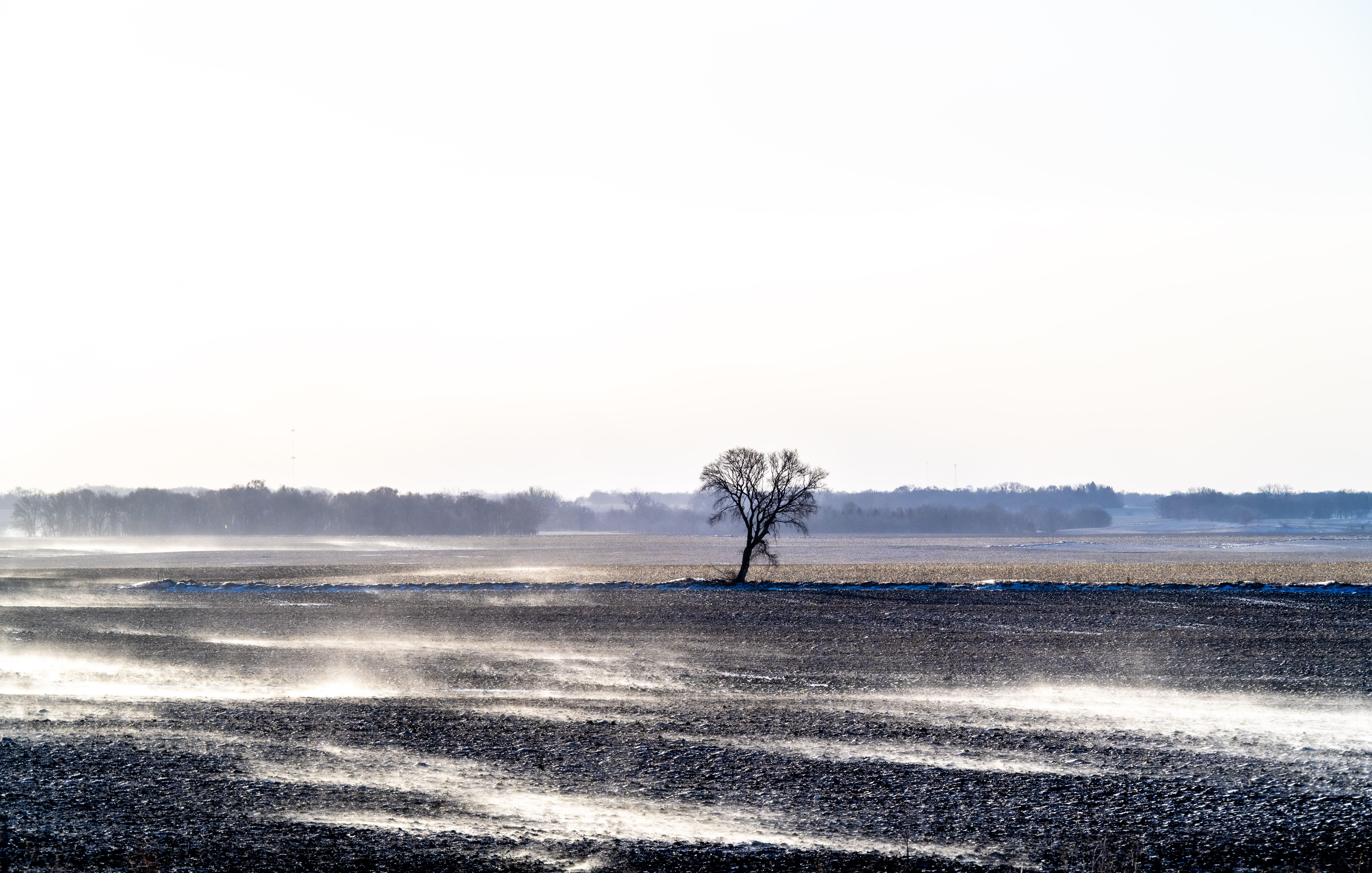 This is, as the old prairie people like to say, a short world. It’s not unlike fog, though much more dangerous. Fog rarely survives in such temperatures. Not around here. We don’t have a lake effect similar to Superior, yet the snow haze seems foggy enough. Almost a pure world of whiteness, except for when you linger over an image where hints of brown, a khaki-looking brownness, shows through. Dirt. Poor dirt after years of indiscriminate farming practices. Yes, dirt is blowing, too, except where stalks were left standing after harvest or the farmer has planted a cover crop.
