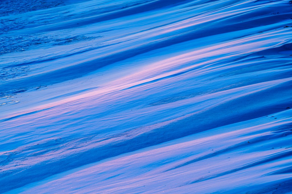 Unless we are blanketed with deep cloud cover, the beauty of ambient colors banking off distant clouds in easterly skies have captured me for decades. Then there are those rare moments of being unexpectedly surprised by the soft blues and purples in wind blown snowy drifts that offers a sudden calmness in the midst of our nation’s turmoil. In these changing times. In these times when a hint of “colorful silence” seems a blessing.