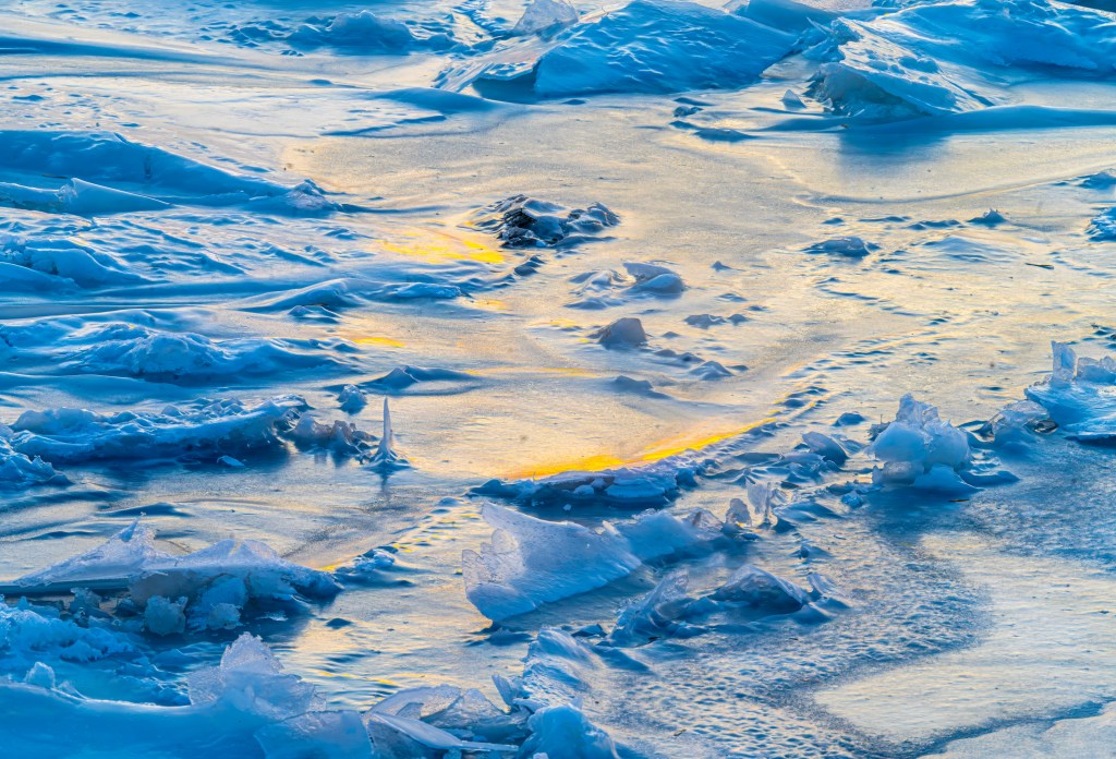 Enough of science. How does this fit into the spectrum of the arts? After looking at the colorful blue and purplish sunset colors amplified by the wind waves at the base of our driveway, a quick review was made of some of the earlier images that had affected me at some point. One example was a Winter Solstice image taken last December. Although I had visualized a different image, a walk to the river’s edge allowed me to find a slight hint of yellowish light in the midst of a jagged ice floe bathed in a soft blue. That yellow seemed to symbolize an emergence of resistance in the depths of the blueish ice — this was barely a week after ICE had landed in Minneapolis, and only a few weeks before their two murders. Within the comfort of blue the yellow seemed a beacon of hope.